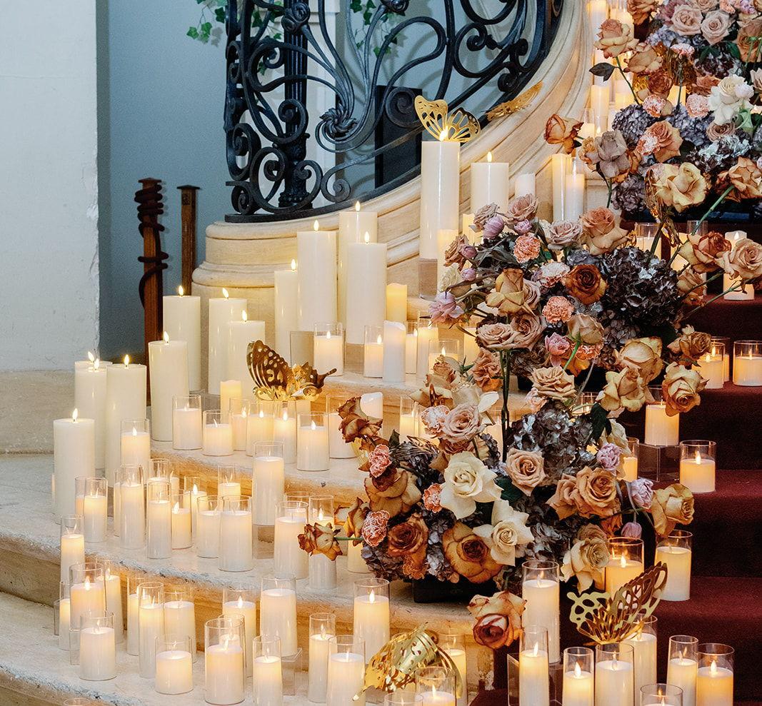 We are here to ease your planning, design, and execution when it comes to candles. Offering an assortment of LED and Live Flame candles to bring your vision to life. No matter the venue policy, we can create a design that illuminates your evening!