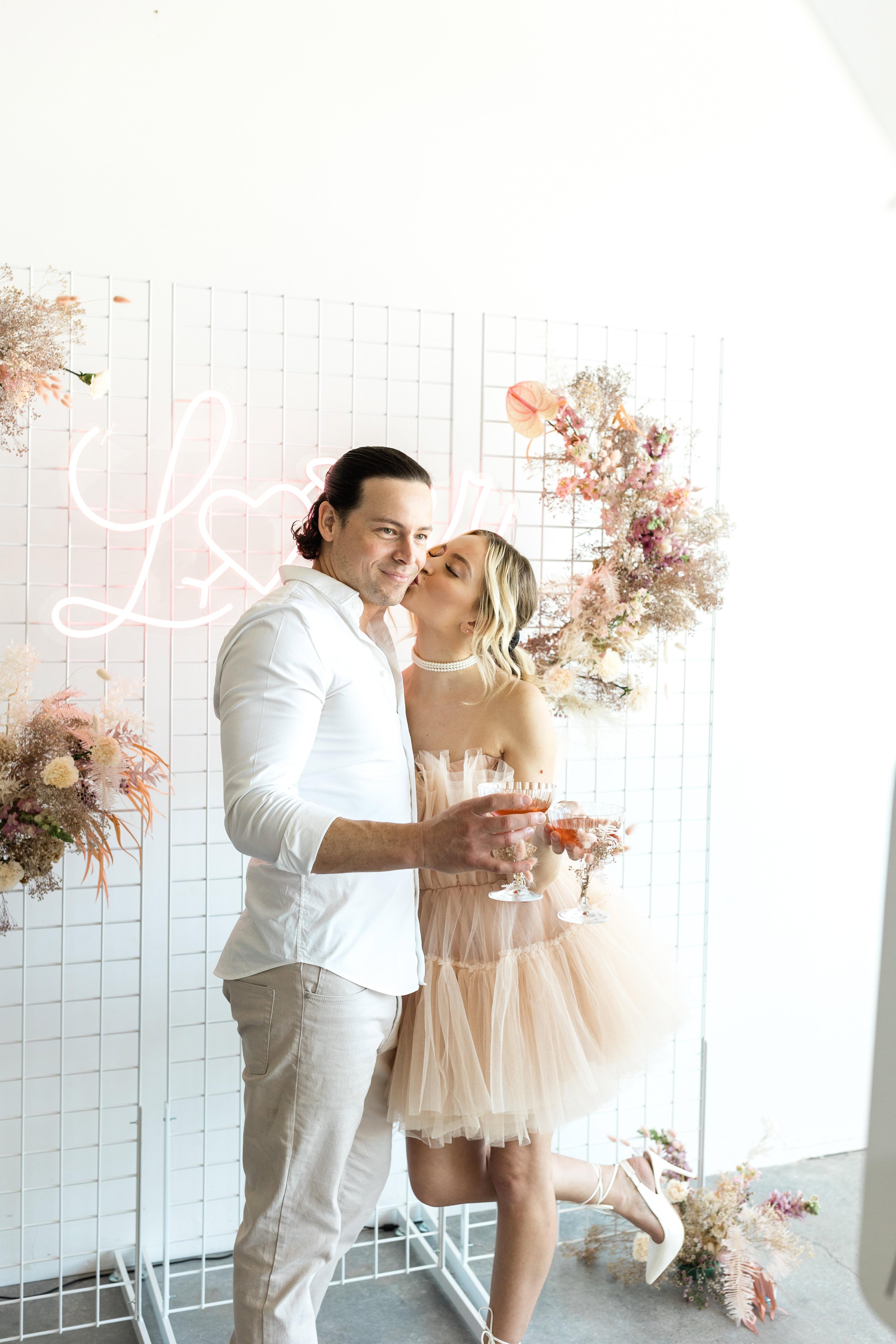 Designed to blend beautifully into your décor. The Signature Studio is our modern photo + print experience created for couples who want timeless portraits, effortless guest flow, and keepsake-worthy prints. Choose from three elevated backdrop styles — Modern Shimmer, Garden Florals, or Dramatic Drapes — and we’ll curate the rest for a seamless, polished finish.