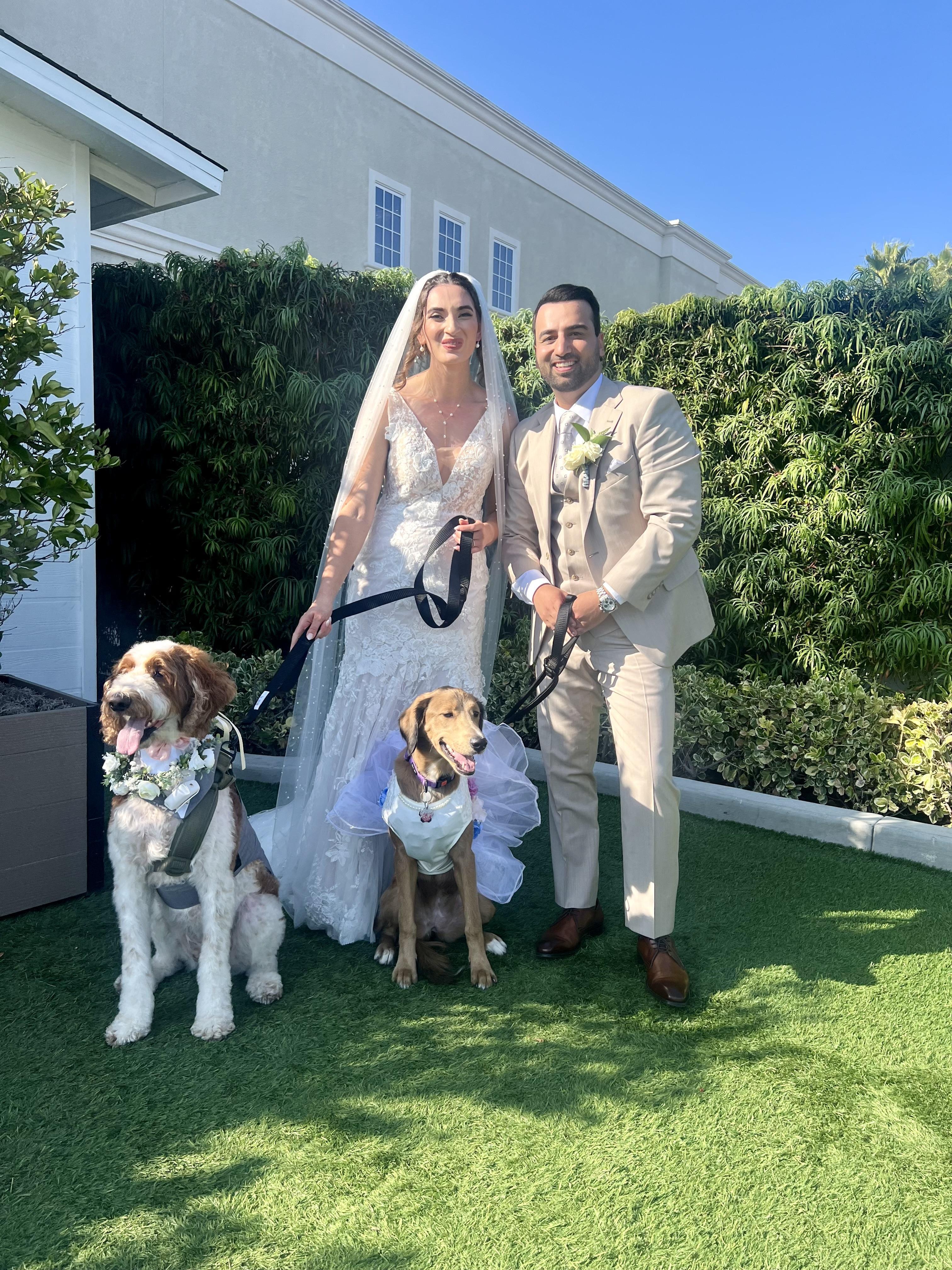 They saved our wedding! Last minute, the company that we had previously booked backed out. It was a destination out-of-state wedding for us, and I was so stressed out and in tears. Lou responded to my email promptly and was able to not only take care of our pups on our wedding day, but also while we stayed two nights at the hotel where we got married (our dogs were at an Airbnb nearby). I couldn’t be more grateful for them. We saw in our dog camera at the Airbnb they were on the floor giving our dogs attention. Our dogs aren’t very easy or well trained dogs, and they never mentioned having any issues with them. They got them to and from our wedding with no problems, gave them their anxiety medication, and even got their leashes and halters on which is a challenge in itself with our dogs. They made it all seem to easy and were on time to our wedding without me ever even needing to reach out to them that day. If you book anyone for your wedding day, book The Wedding Leash!