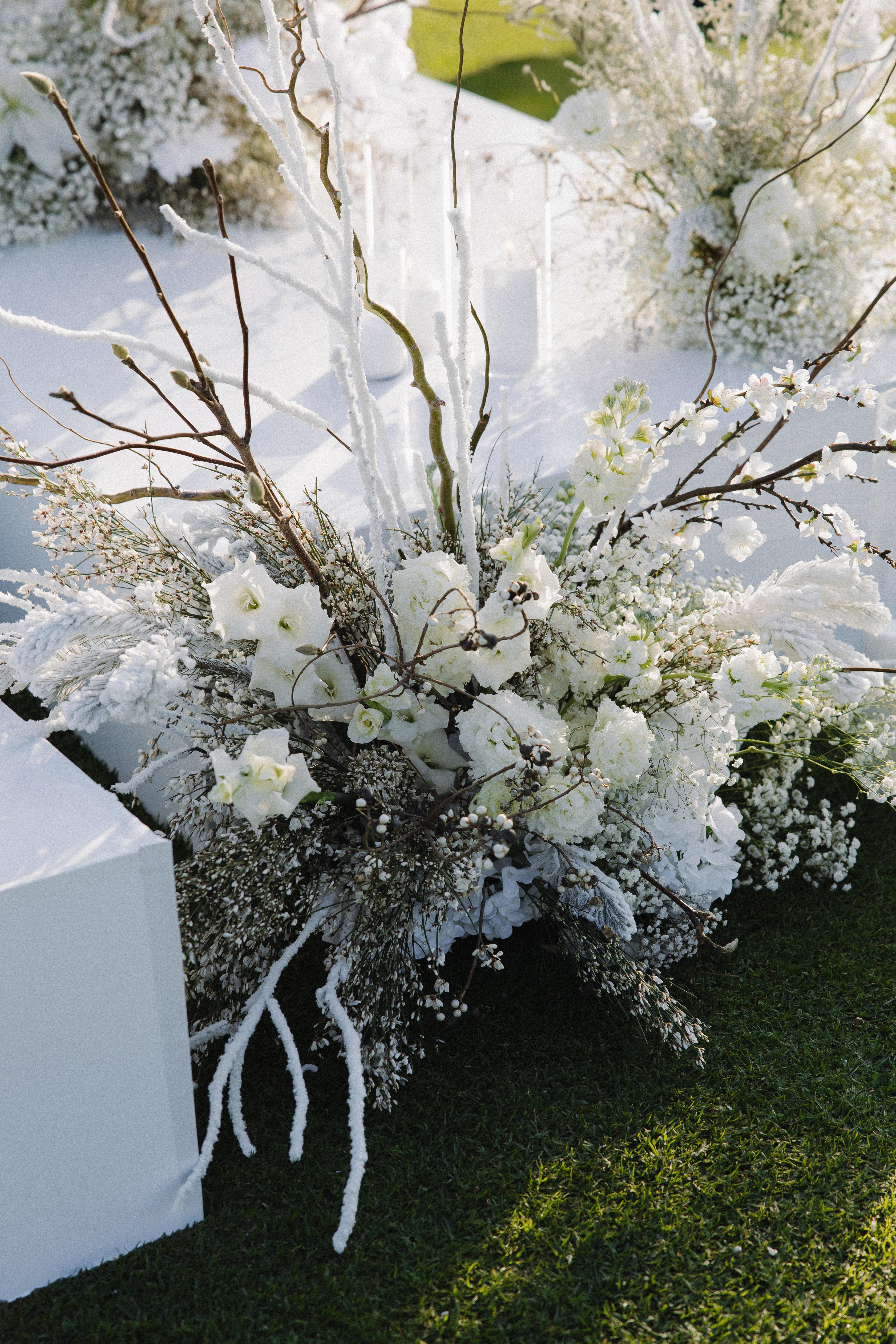Includes: BRIDAL BOUQUET MAID OF HONOR AND BRIDESMAID BOUQUETS BOUTONNIERE GROOMSMEN BOUTONNIERES SWEETHEART TABLE ARRANGEMENTS OR INSTALL CEREMONY STRUCTURE CEREMONY ARRANGEMENTS (AISLE PIECES/PETALS) GUEST CENTERPIECES (OR BUDVASES OR IKEBANA) 3 TABLE ARRANGEMENTS (GUEST BOOK TABLE, PLACE CARD TABLE, BAR, ETC.) COCKTAIL ARRANGEMENTS HURRICANE CANDLES CANDLE PILLARS CAKE FLOWERS (COMPLIMENTARY) TOSS BOUQUET (COMPLIMENTARY) Those looking more for an impactful floral look.