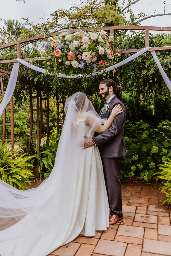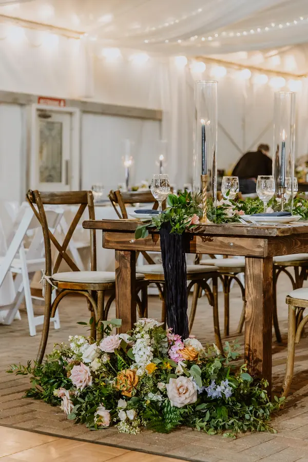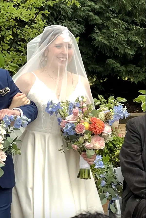 Svitlana and team’s florals completely elevated our wedding. I truly don’t think it would have looked as magical as it did without her florals! She did SUCH a beautiful job capturing the romantic, garden-party vibe. I got SO many compliments on the florals! My bouquet was GORGEOUS. I loved the colors. I wish I had had plans to professionally preserve it, but I pressed a few flowers from it. The wedding ceremony decor was so lush, and she even added some extra small details to the aisle/ chairs! For the reception we had round tables, plus one long table for the head table with a garland, and it was perfect. 100% go with Sweety Dream, you will not regret it!!