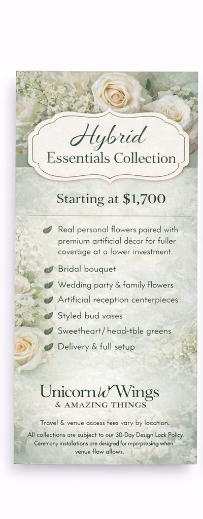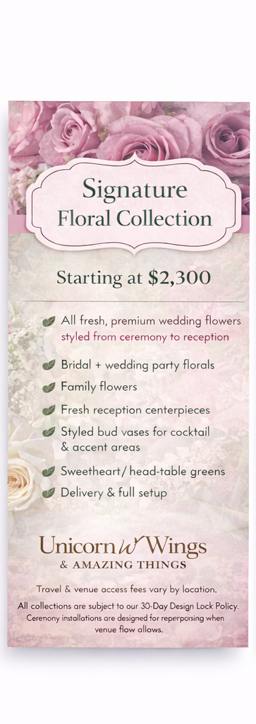 At Unicorn Wings & Amazing Things, I specialize in crafting magical, budget-friendly weddings that reflect your unique love story. My mission is to deliver exceptional quality and meticulous attention to detail, ensuring your dream wedding becomes a reality. Explore My Unique Packages: DIY Wedding Kits: Perfect for hands-on couples, my DIY kits provide all the essentials you need to create a beautiful wedding with the flexibility to customize as you wish. Bundle and Save: Take advantage of my bundled packages to enjoy significant savings, making it easier to get everything you need without breaking the bank.