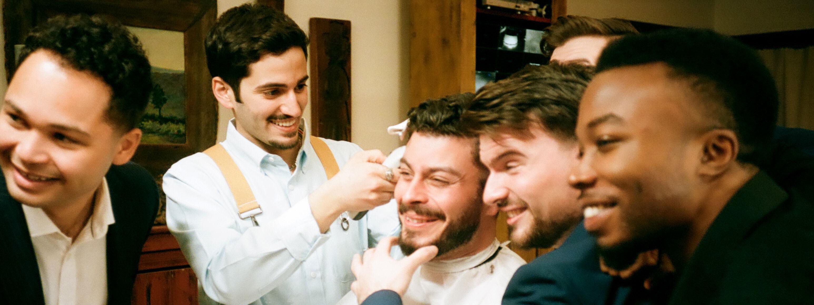 Services for fathers, officiants, or VIP guests. Includes two haircuts, hot towel beard services, and styling.