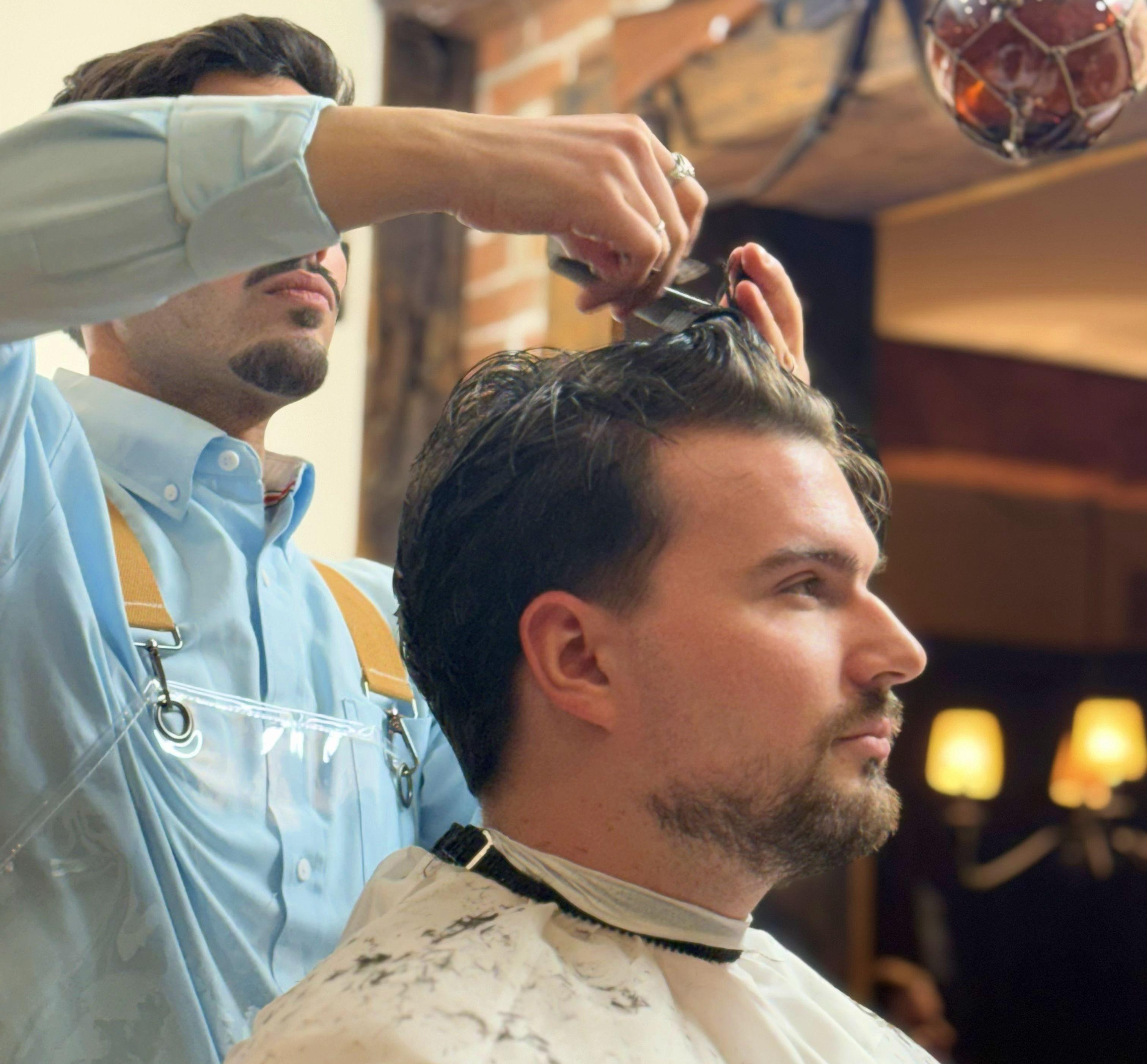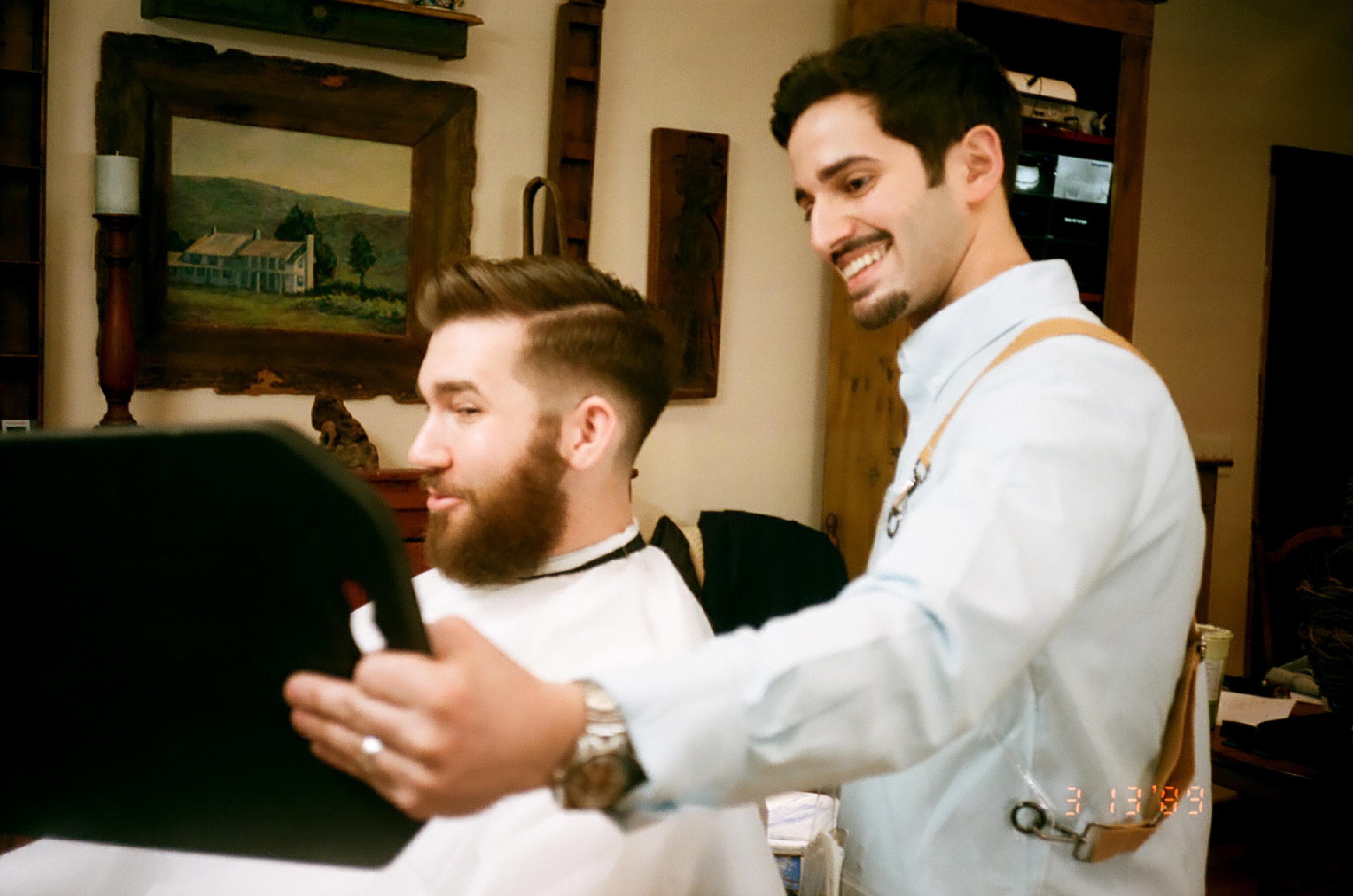 Groom-focused haircut, hot towel beard service and styling.