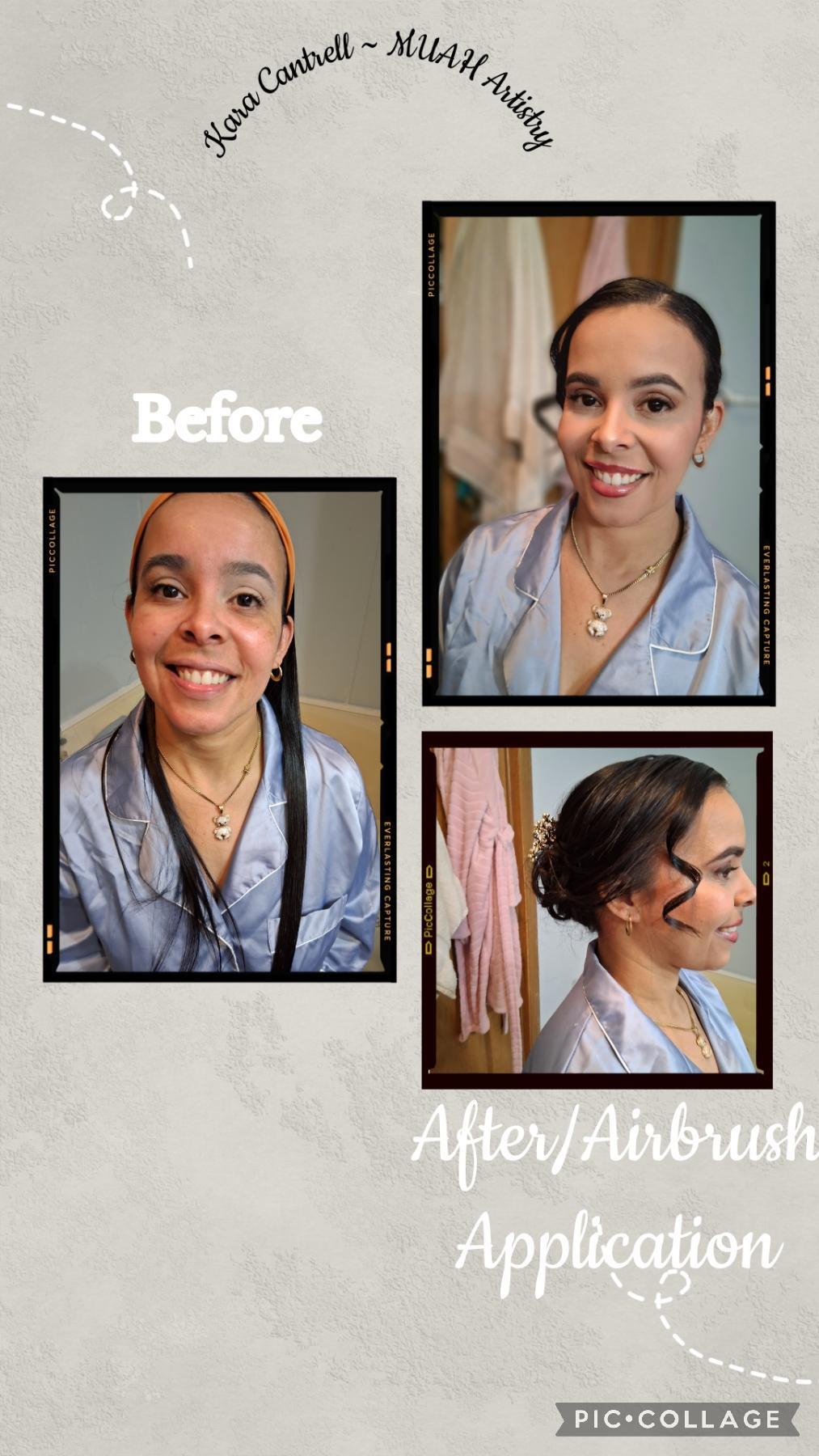Bride +1. Includes trial run for both hair and make up for bride. Your choice of traditional or airbrush. Any updo regardless of the intricacies. The day of hair and make up. Strip Lashes. Touch Up kit. Covers 120 mile travel fee.