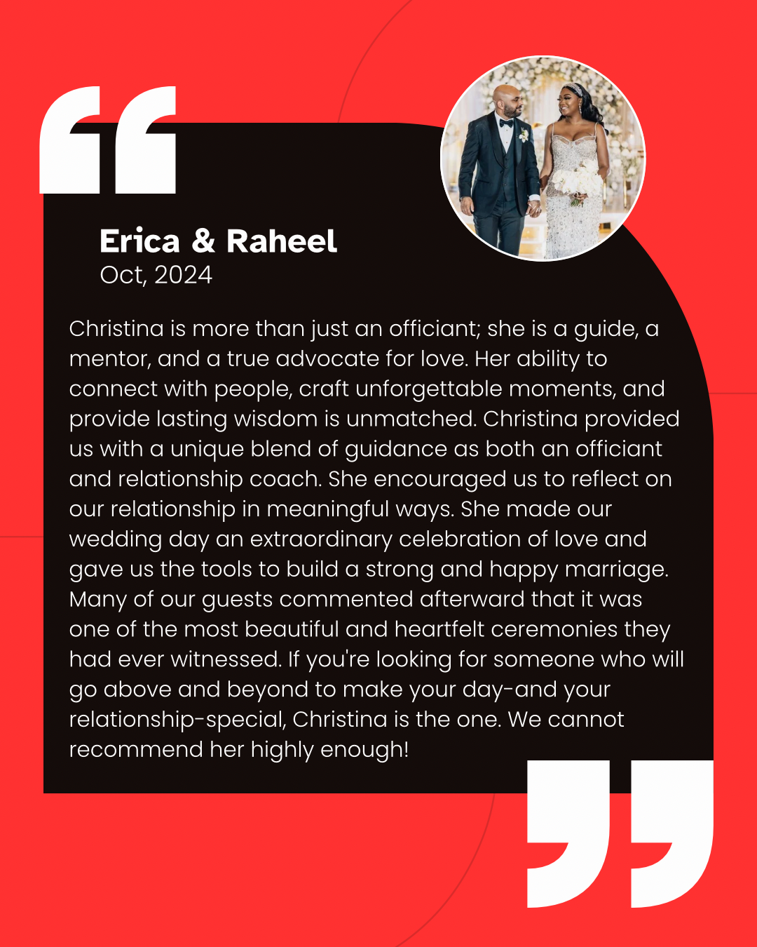 When it comes to selecting a wedding officiant and relationship coach, there are few individuals as extraordinary as Christina. From the moment we first connected with her, it was clear that she was not just an officiant but also a deeply compassionate, insightful, and genuinely invested coach who cared about the success of our marriage just as much as she cared about our special day. Christina went above and beyond in every aspect of the process, leaving us with an experience we will cherish forever. Christina’s involvement in our wedding planning process was nothing short of transformative. She took the time to truly get to know us as individuals and as a couple, listening intently to our story, values, and dreams for the future. Unlike other officiants who may simply focus on the ceremony, Christina provided us with a unique blend of guidance as both an officiant and relationship coach. She encouraged us to reflect on our relationship in meaningful ways, offering advice and tools to help us grow stronger as a couple. One standout moment was a personalized exercise Christina created just for us. It involved us answering questions about each other in separate sessions and at the end listening to how each of us answered the questions was such an intimate touch, and which she later wove into our ceremony. Not only was this an emotional and heartfelt experience, but it also deepened our connection and reminded us of the foundation of our love. On our wedding day, Christina was nothing short of magical. She brought a warmth and energy to the ceremony that resonated deeply with us and our guests. Her words were heartfelt and tailored to reflect our unique love story, weaving in anecdotes and insights that made the entire experience feel deeply personal. Christina’s delivery was flawless—her tone, pacing, and sincerity captivated everyone present. She struck the perfect balance between humor, emotion, and wisdom, making the ceremony both uplifting and unforgettable. Many of our guests commented afterward that it was one of the most beautiful and heartfelt ceremonies they had ever witnessed. What sets Christina apart is her commitment to ensuring that your relationship is as strong as your wedding day is beautiful. As a relationship coach, she provided us with invaluable advice and practical tools to carry into our marriage. One piece of advice she shared—about approaching challenges as a team rather than as individuals—has already helped us navigate life together with greater understanding and empathy. Her coaching sessions felt like talking to a trusted friend who genuinely wanted to see us succeed. Christina’s insights were profound, yet she delivered them in a way that was accessible and relatable. She left us feeling empowered and excited about our future together. Christina is more than just an officiant; she is a guide, a mentor, and a true advocate for love. Her ability to connect with people, craft unforgettable moments, and provide lasting wisdom is unmatched. She made our wedding day an extraordinary celebration of love and gave us the tools to build a strong and happy marriage. If you’re looking for someone who will go above and beyond to make your day—and your relationship—special, Christina is the one. We cannot recommend her highly enough!