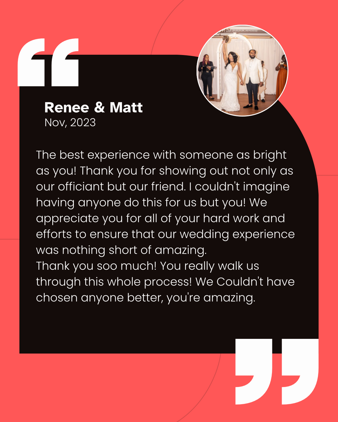 Our wedding officiant from With Love Weddings was absolutely wonderful. From our first interaction, she was friendly, thorough, and flexible, taking the time to get to know us and understand our vision for the ceremony. Her enthusiasm and authenticity were evident throughout the entire process, and the quality of her work was truly exceptional. She is very detail-oriented and takes her time to provide the most personalized experience. You can tell she really loves what she does, and that passion shines through in the high-quality ceremony she delivered. We are so grateful to have her as part of our special day.