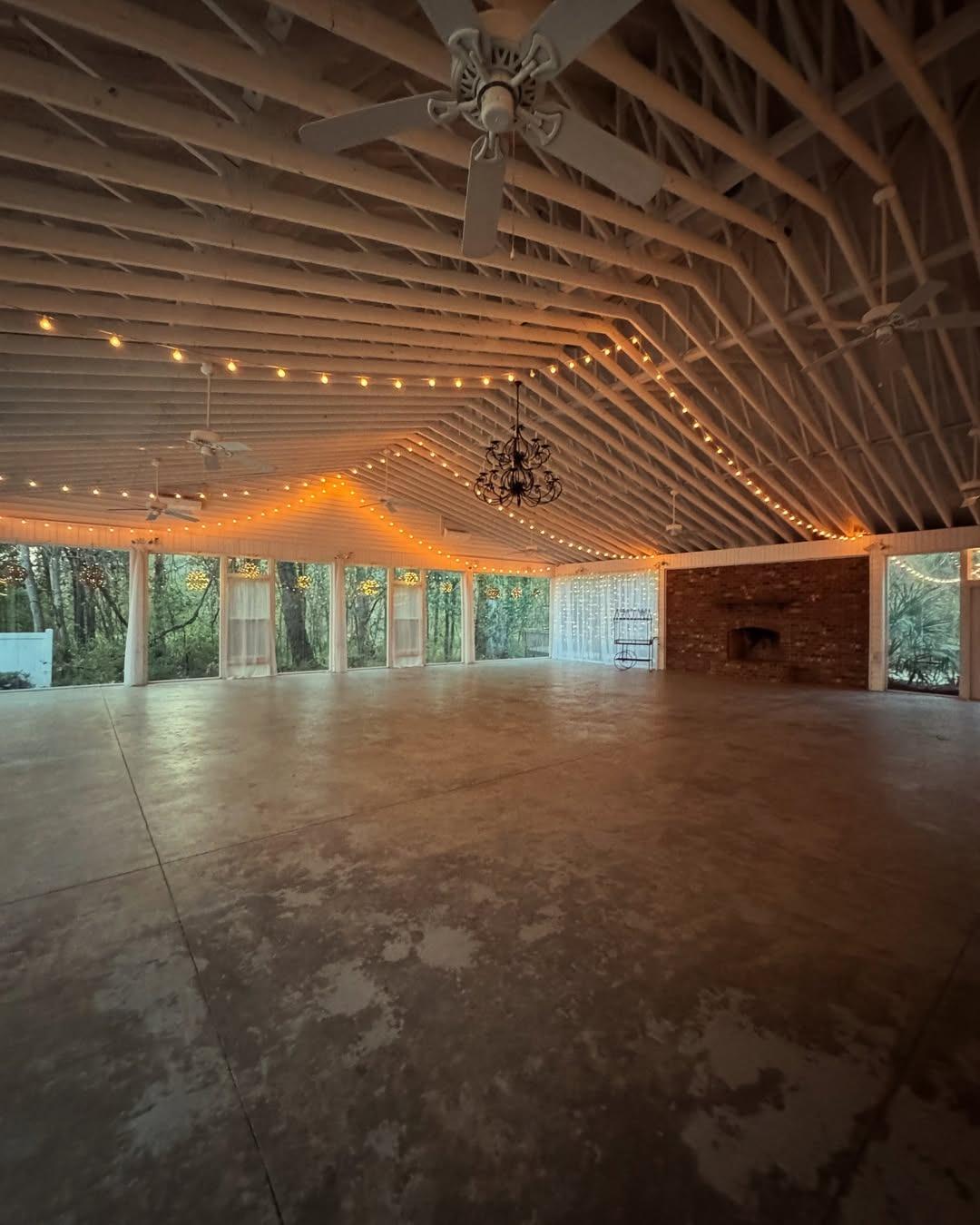 The open-concept design and massive windows create a 'garden-party' atmosphere that remains comfortable regardless of the weather. Many mention that the pavilion feels incredibly spacious yet intimate, thanks to the warm glow of the overhead lighting and the focal point of the brick hearth. It is the type of space that feels naturally elegant on its own, yet serves as a perfect blank canvas for any floral or decor vision, leaving guests feeling relaxed and inspired throughout the evening.