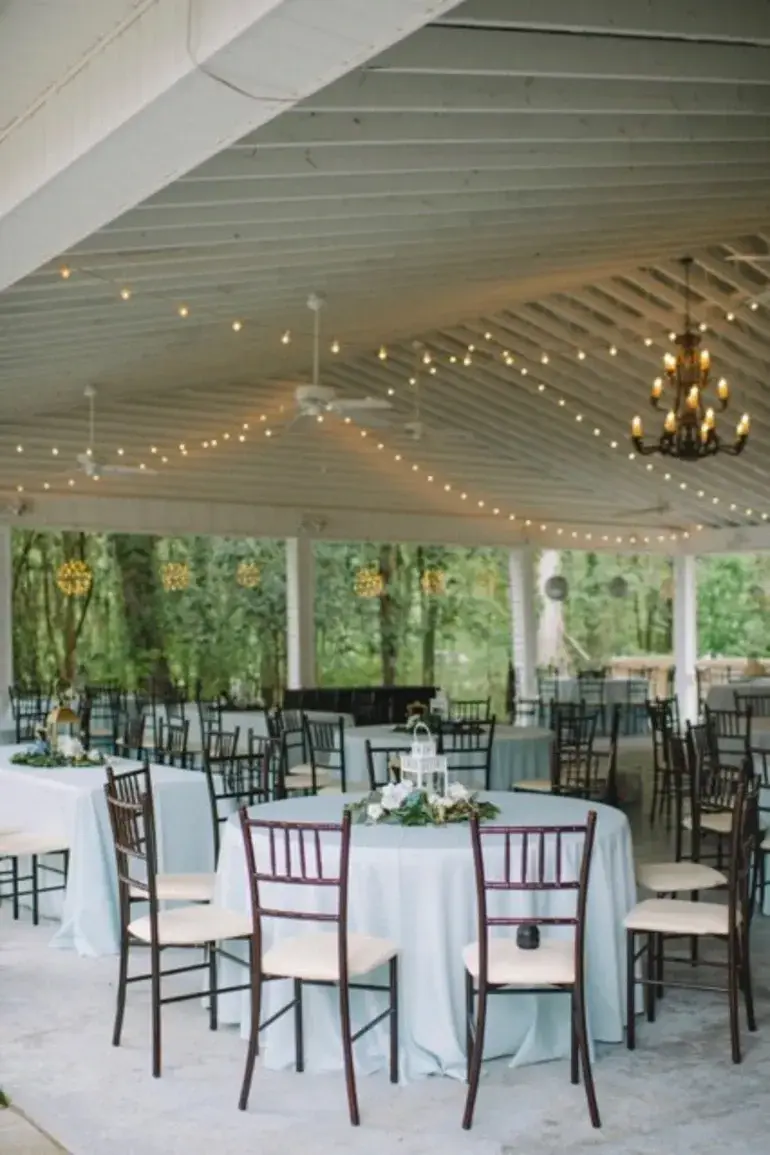 Step outside to our enclosed, air-conditioned Pavilion, where you can relax with conversational seating around a cozy wood-burning fireplace, enjoy the bar, and admire the elegant lighting. A charming wooden walkway leads you to the stunning wedding gardens.