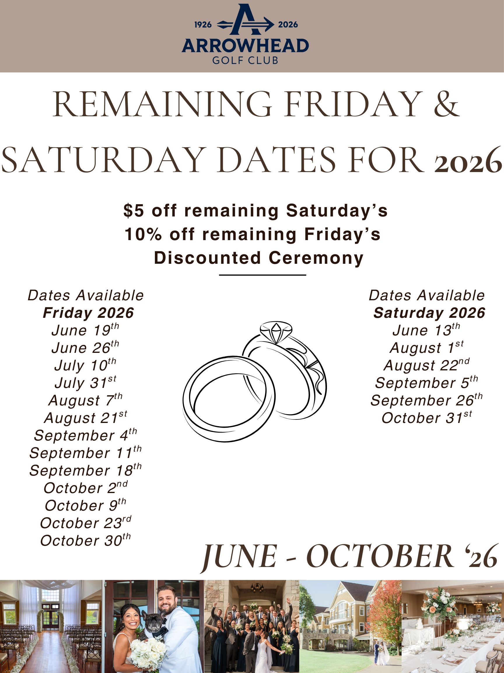 After touring probably 10 wedding venues, it was easy for us to pick Arrowhead Golf Club for our wedding day. They are truly all-inclusive and are accommodating to any budget. They offer various meal packages and you can pick and choose almost anything you want so you get the exact ceremony and reception you want! One of the biggest selling points for us was getting to work with Lauren, a member of the Events staff at Arrowhead. She responded quickly to every single email we ever sent her throughout our year of planning. She helped make our wedding day flow so smoothly from beginning to end. We also wound up booking our rehearsal dinner at Arrowhead. Every member of our event staff was nice and great! All of our guests thought the space was beautiful and could only say good things about Arrowhead. I'm so happy we chose Arrowhead for our big day and it will always hold a special place in our hearts!