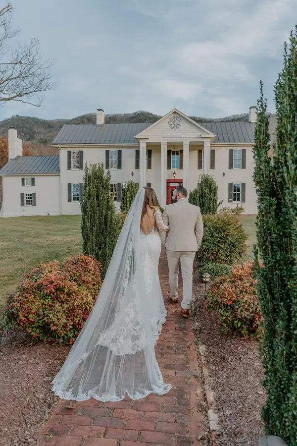 The Event Barn is 3,700 sq ft with a fully stocked commercial prep kitchen, two handicap-accessible bathrooms, and a spacious reception area adorned with rustic crystal chandeliers and ambiance lighting. The barn opens up to large patios overlooking majestic mountains and rolling hills. The kitchen is stocked with serving dishes, chafing dishes, drink dispensers, commercial warming oven, a commercial refrigerator, a freezer, and much more. We also supply beautiful rustic wooden chairs, round dining tables, buffet tables, two oversized custom farm tables, and a stunning ceremony arch that can be placed anywhere on the estate. You also have access to our professional sound system and we maintain a large selection of neutral in-house décor that you can use as much or as little of as you like. There are three historic houses on the estate that are included in your wedding package. The Manor House sleeps up to 12 and is ideal for bridal party dressing and staging. The Icehouse Cabin sleeps 6 and the Farmhouse 4.
