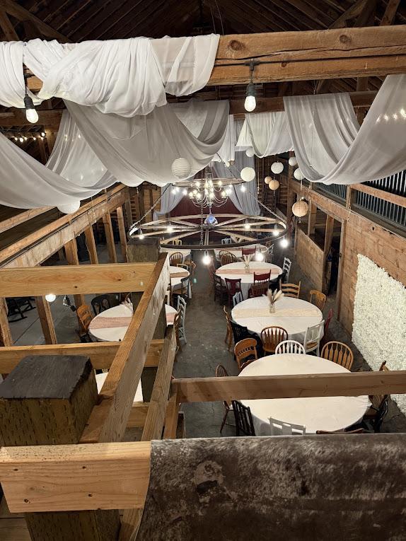 The main barn is 40x60 (2400 sq feet) with an upper balcony that surrounds the lower floor (like a U) There are 8 round tables included, with white table cloths that have 9 different wood antique chairs for each, also 2 wood oblong tables with leaves and 10 chairs each