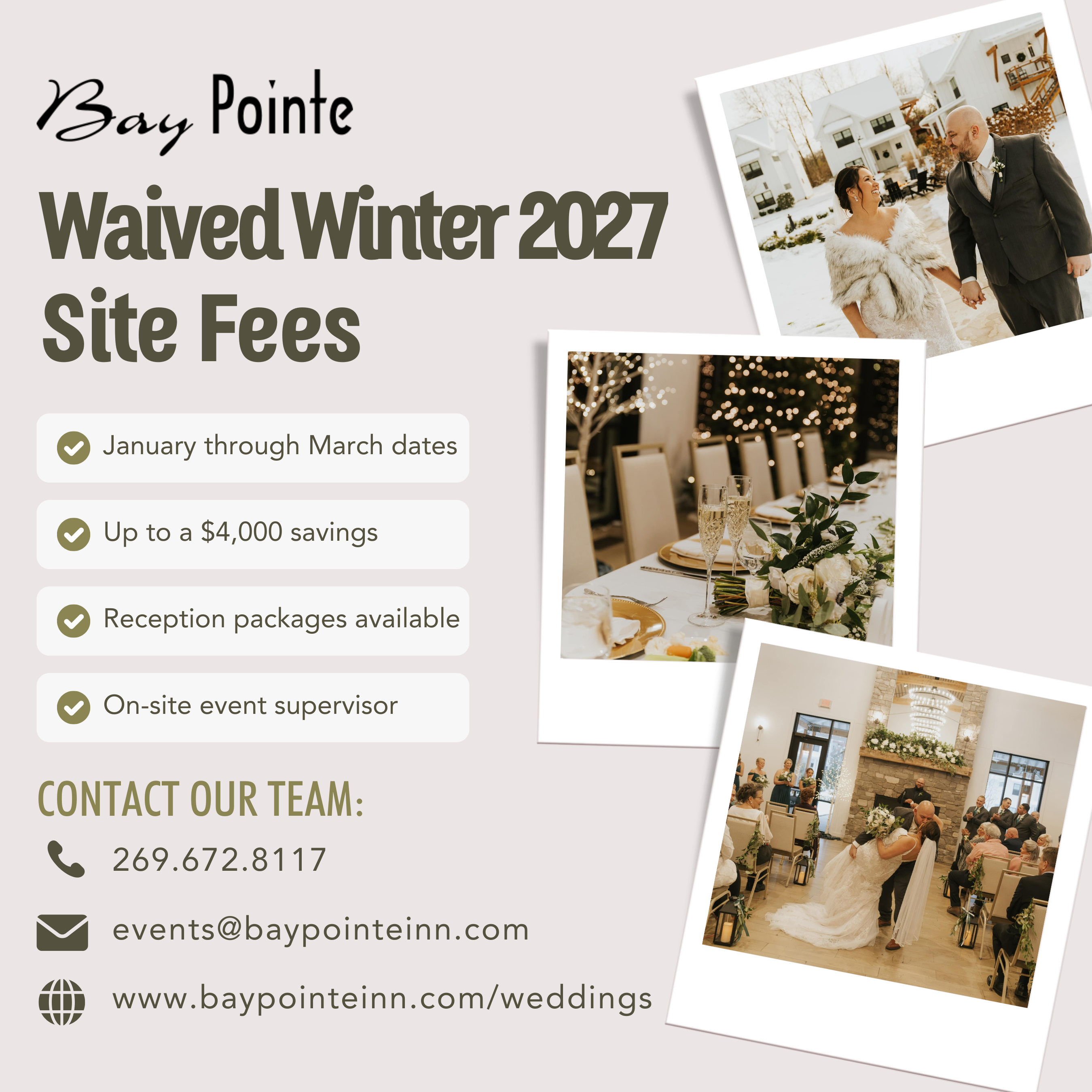 From the moment we booked Bay Pointe as our wedding venue, the staff was incredibly helpful, responsive, and knowledgeable. They were there to assist us with every detail, even making last-minute changes to the setup to give our guests an even better experience. The venue itself is simply stunning - the property is beautifully maintained, and every aspect of the space is clean, elegant, and thoughtfully designed. Our guests raved about the venue, the food and the cottages. We couldn't have been happier with how our special day turned out. The friendly and accommodating staff truly went above and beyond to make our wedding day perfect.