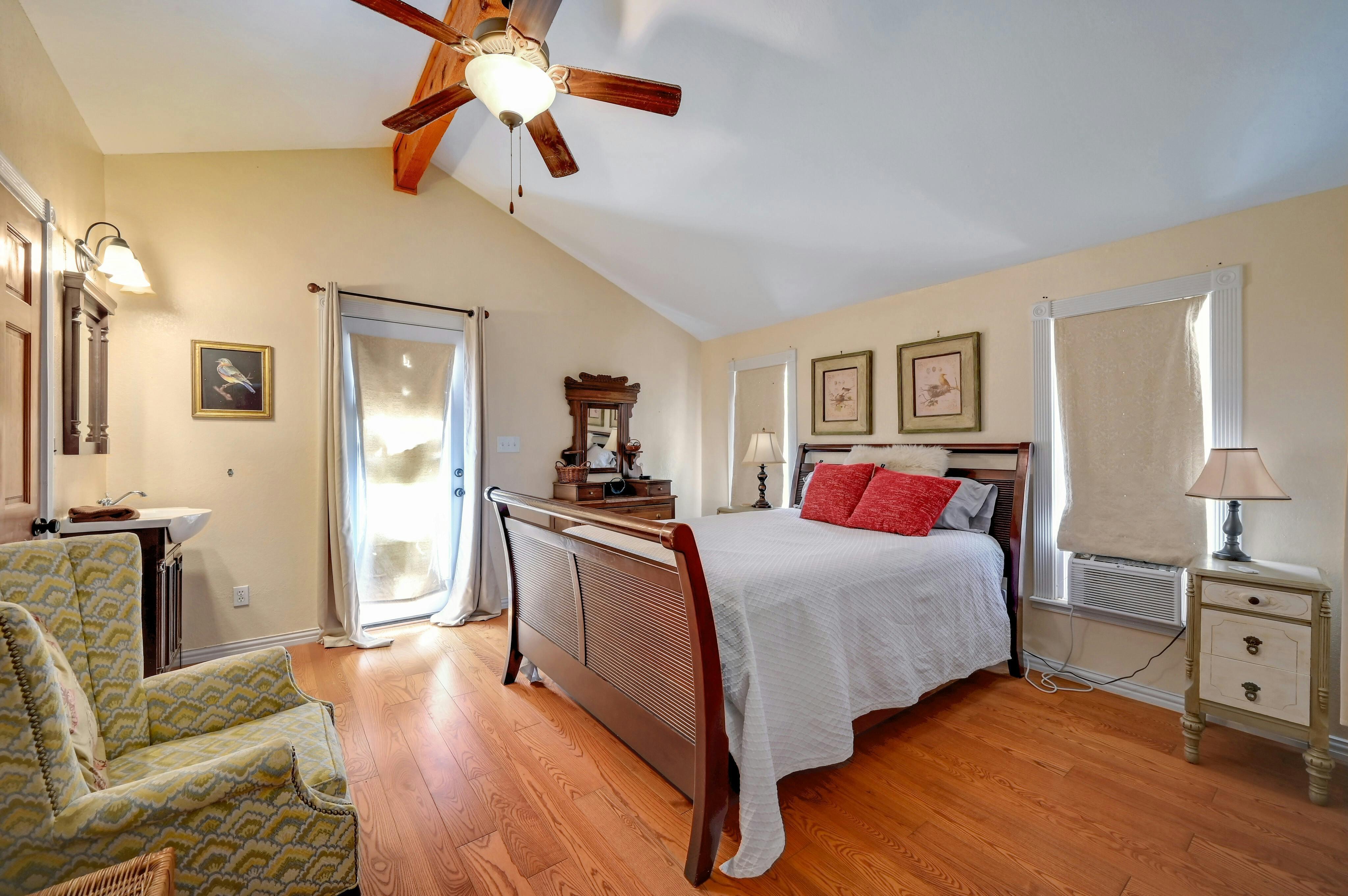 This space features 3 bedrooms, 4 bathrooms, a dining room, living room, and a kitchen. Located between the reception barn and the chapel, it's the perfect space for the bridal party to gather before the ceremony.