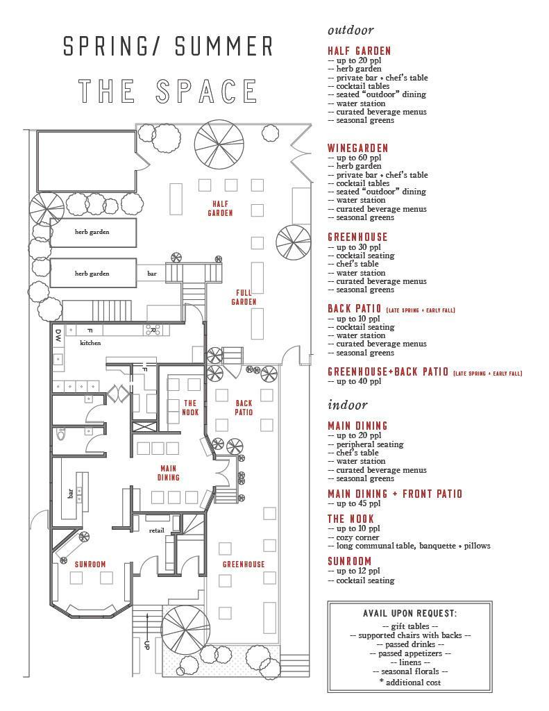 -- private bar + chef's table -- cocktail tables -- seated 'outdoor' dining -- water station -- curated beverage menus + welcome signs -- seasonal greens -- herb garden