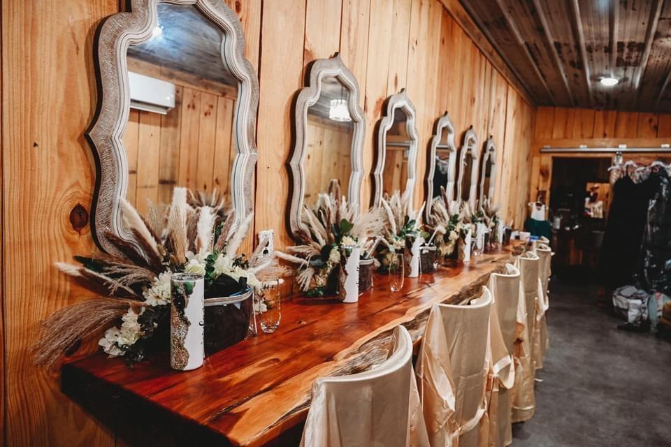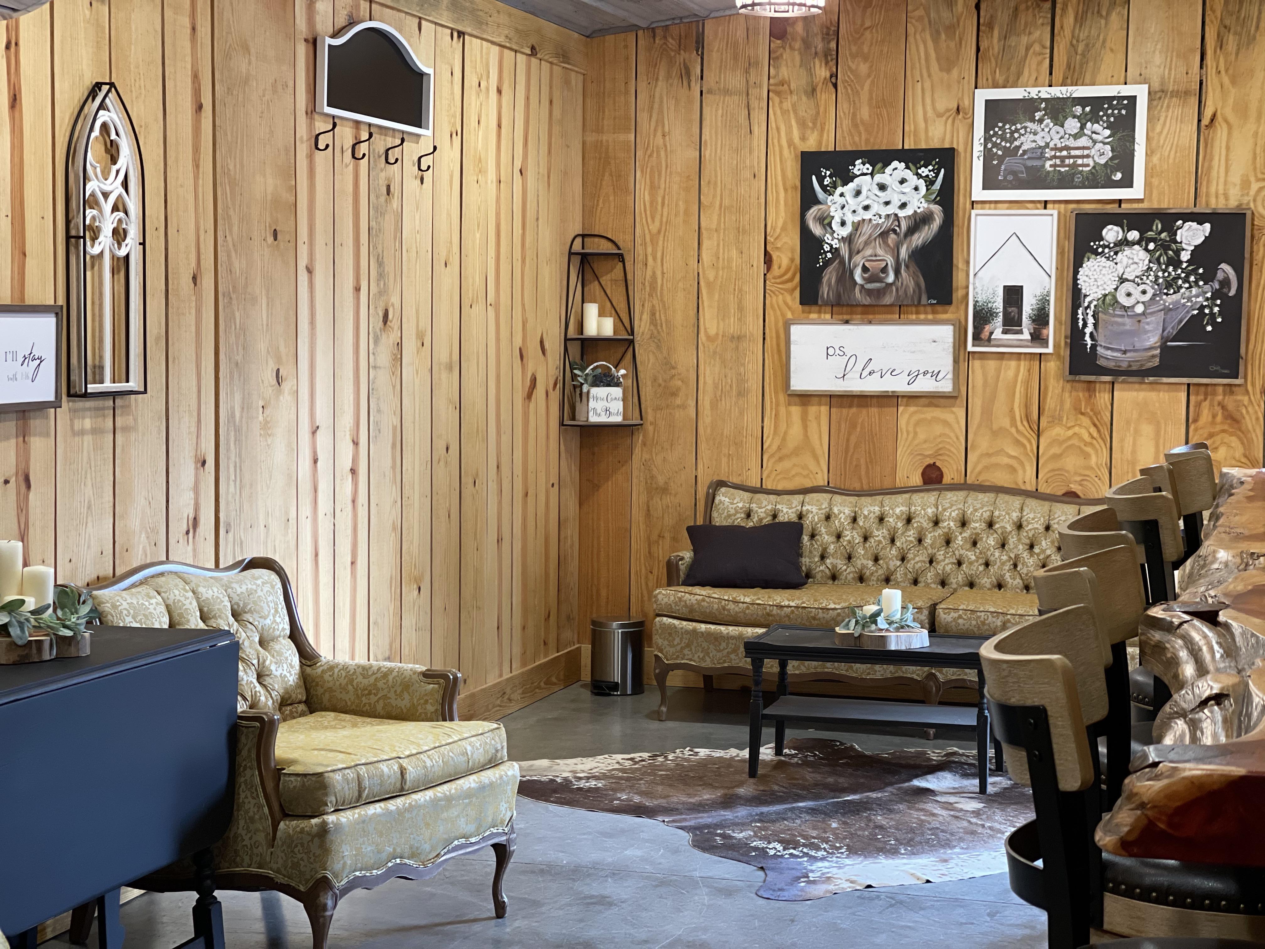 Complete with wood-paneled walls, farmhouse decor, and a vanity counter with plenty of seating, this cozy, rustic suite is is the perfect place to relax, toast to your big day with your bridesmaids, and prepare for the "I do's" before the ceremony. Lounge on cozy vintage furniture, use the combination coffee/mimosa bar and mini fridge for breakfast or brunch, and unwind with your bridesmaids while you get ready for the day.