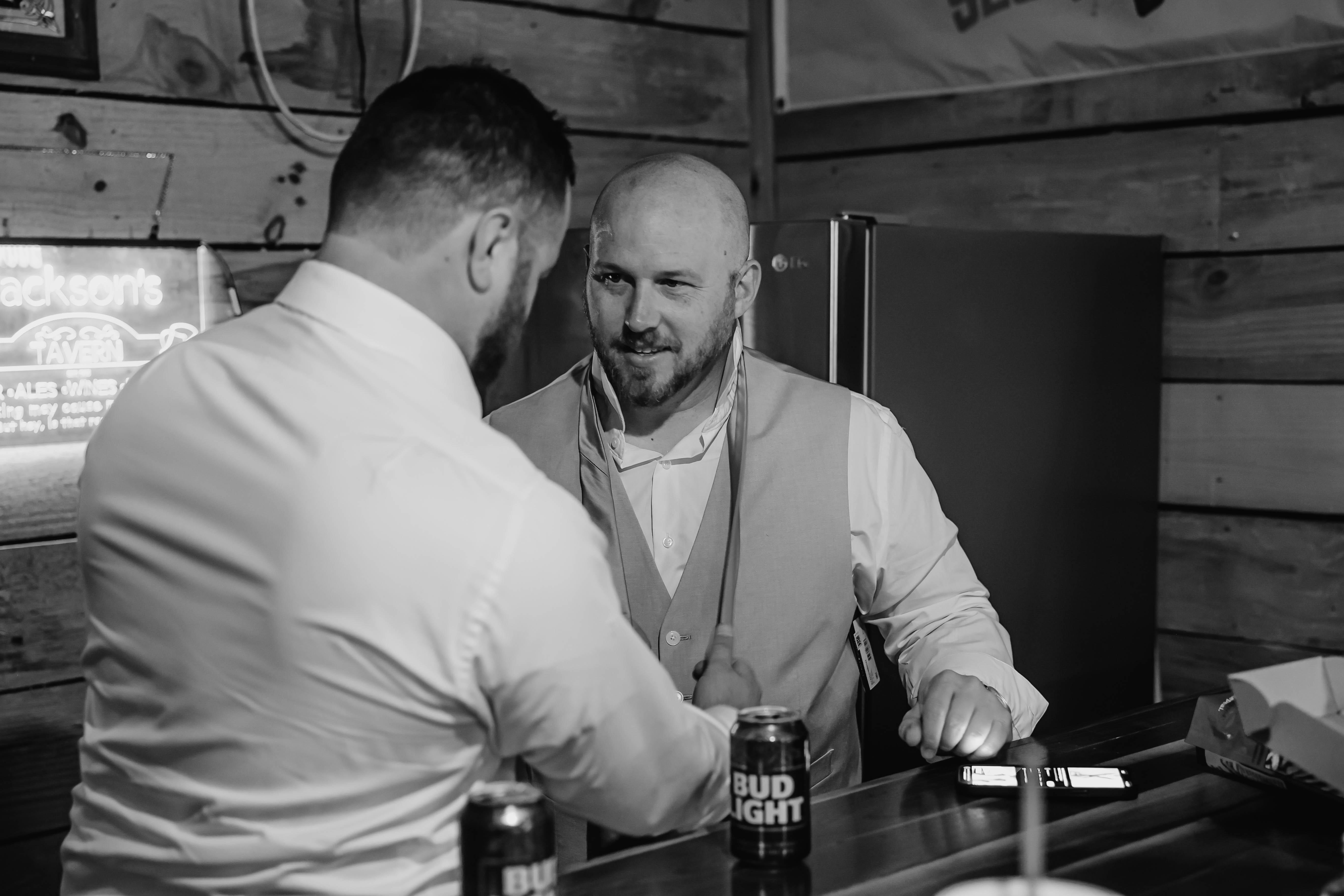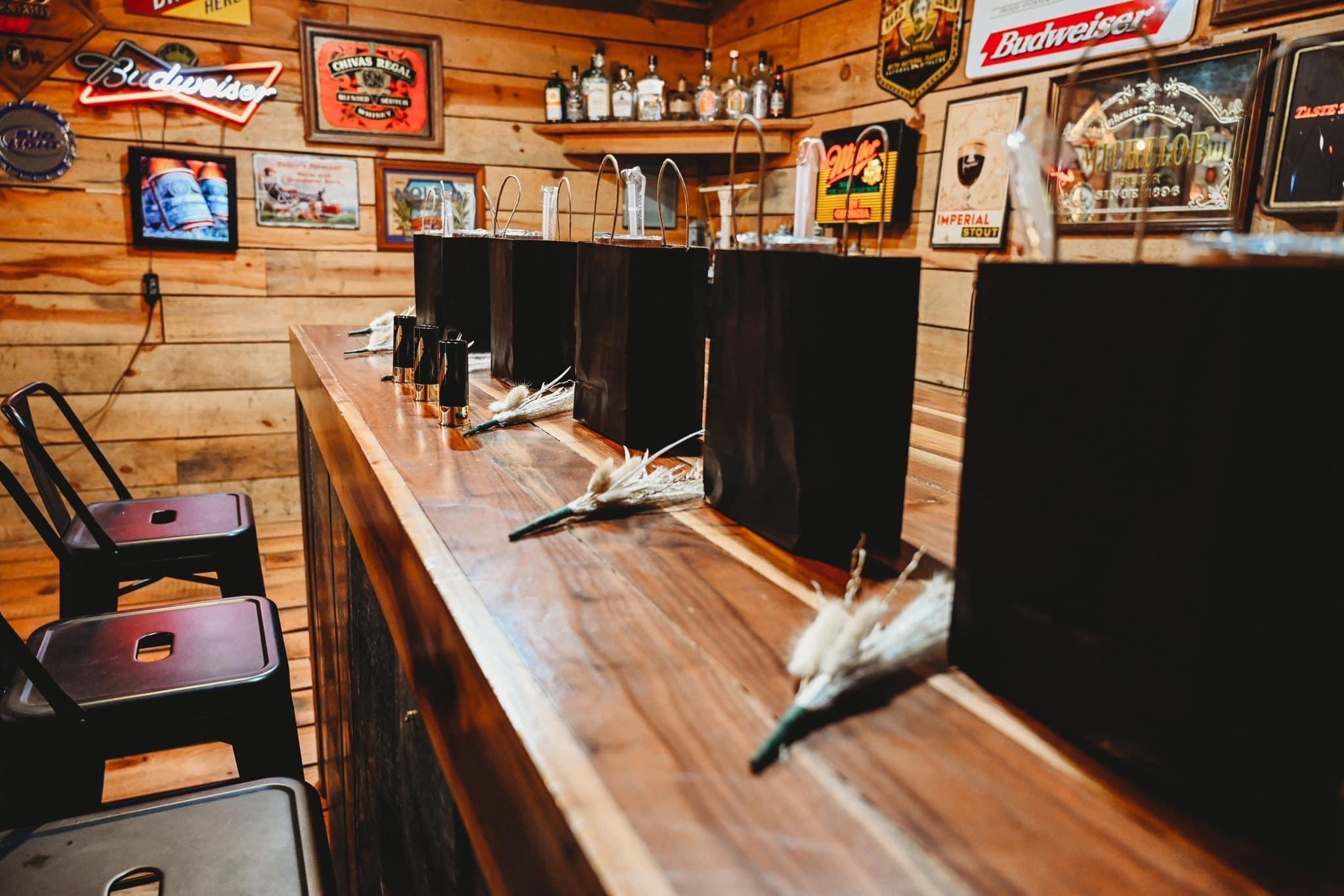 This rustic groom's cabin is the perfect getaway, situated just up the hill from the reception barn and bridal suite. Featuring antique beer signs, comfy furniture, and a built-in bar with seating, you and your groomsmen will love hanging out here.