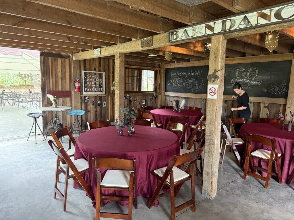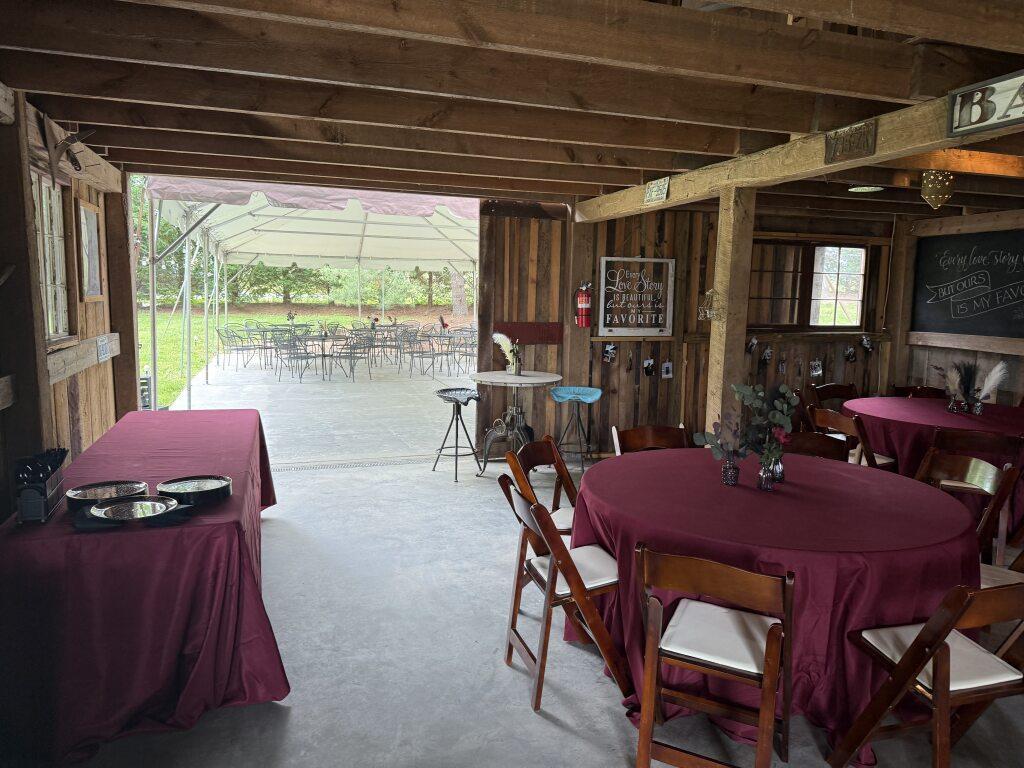 Standard tables and chairs Indoor rustic barn space with patio Private bar area staffed by Burntshirt Ample parking
