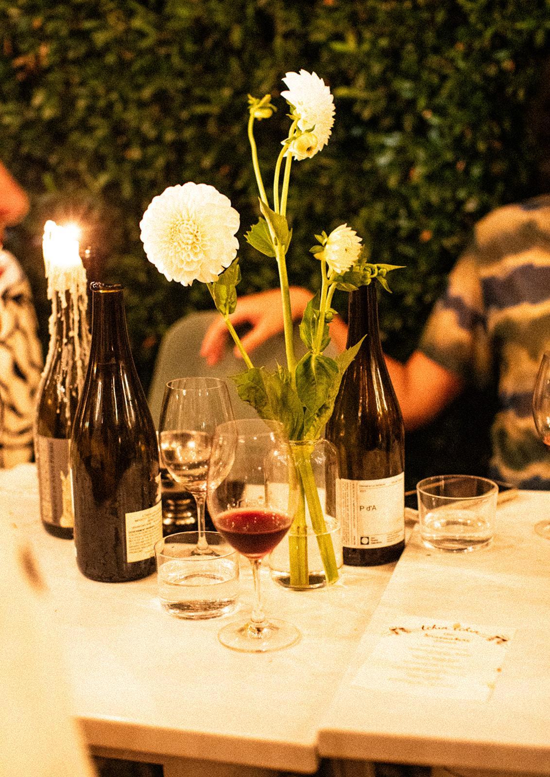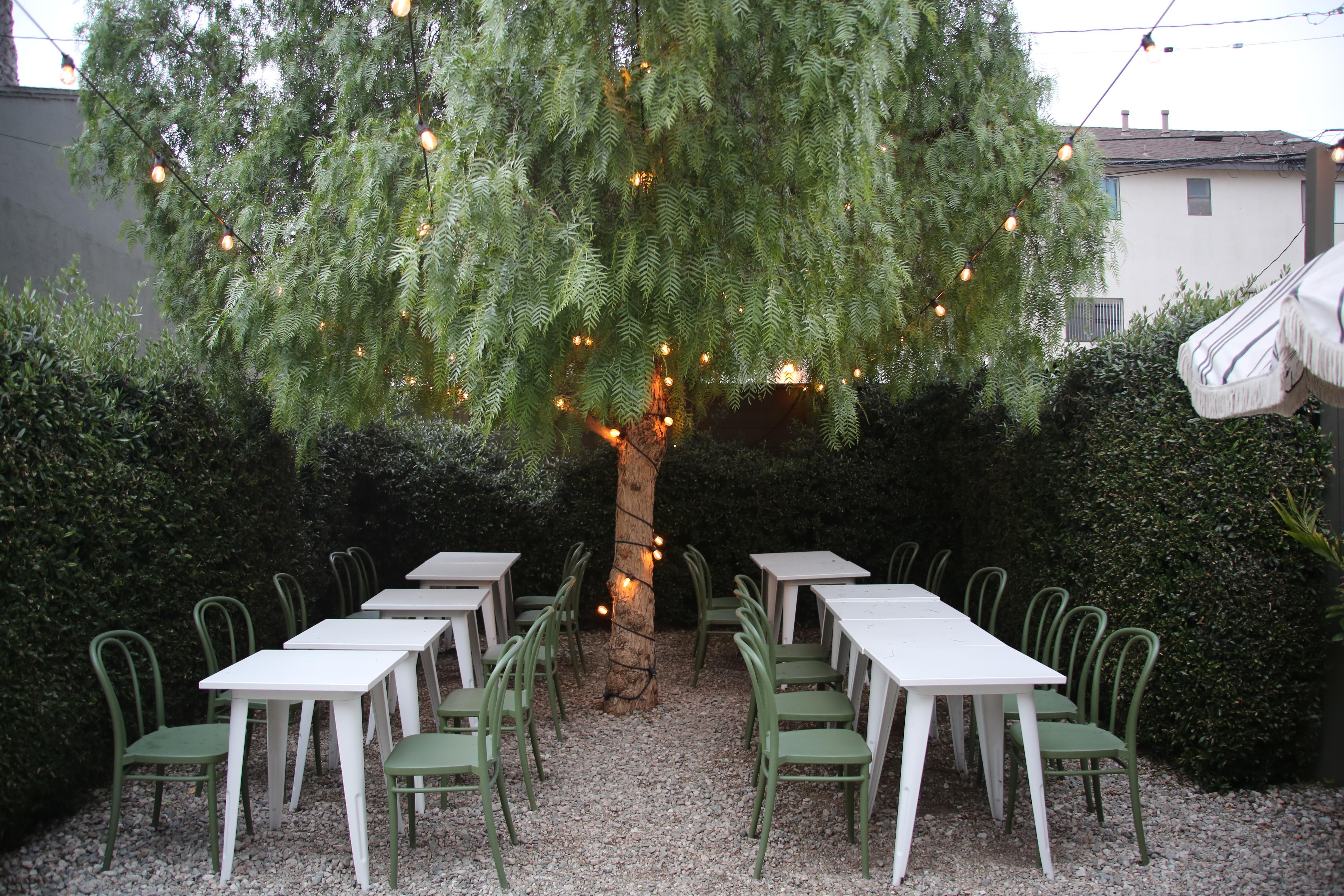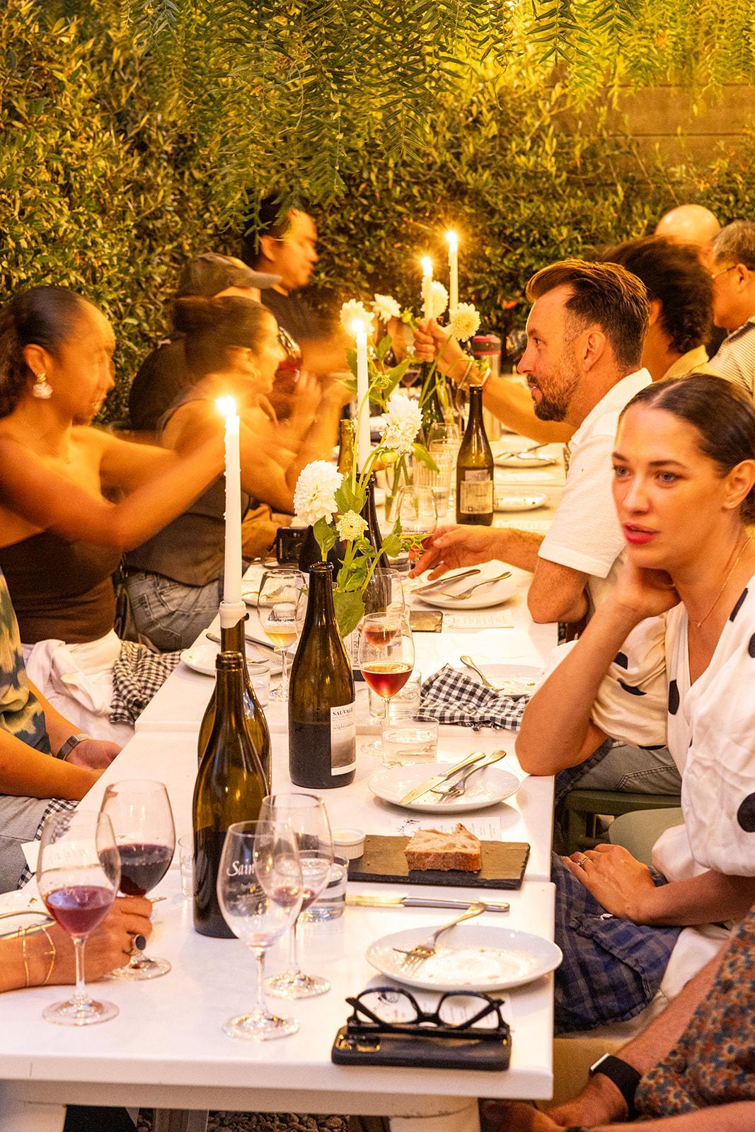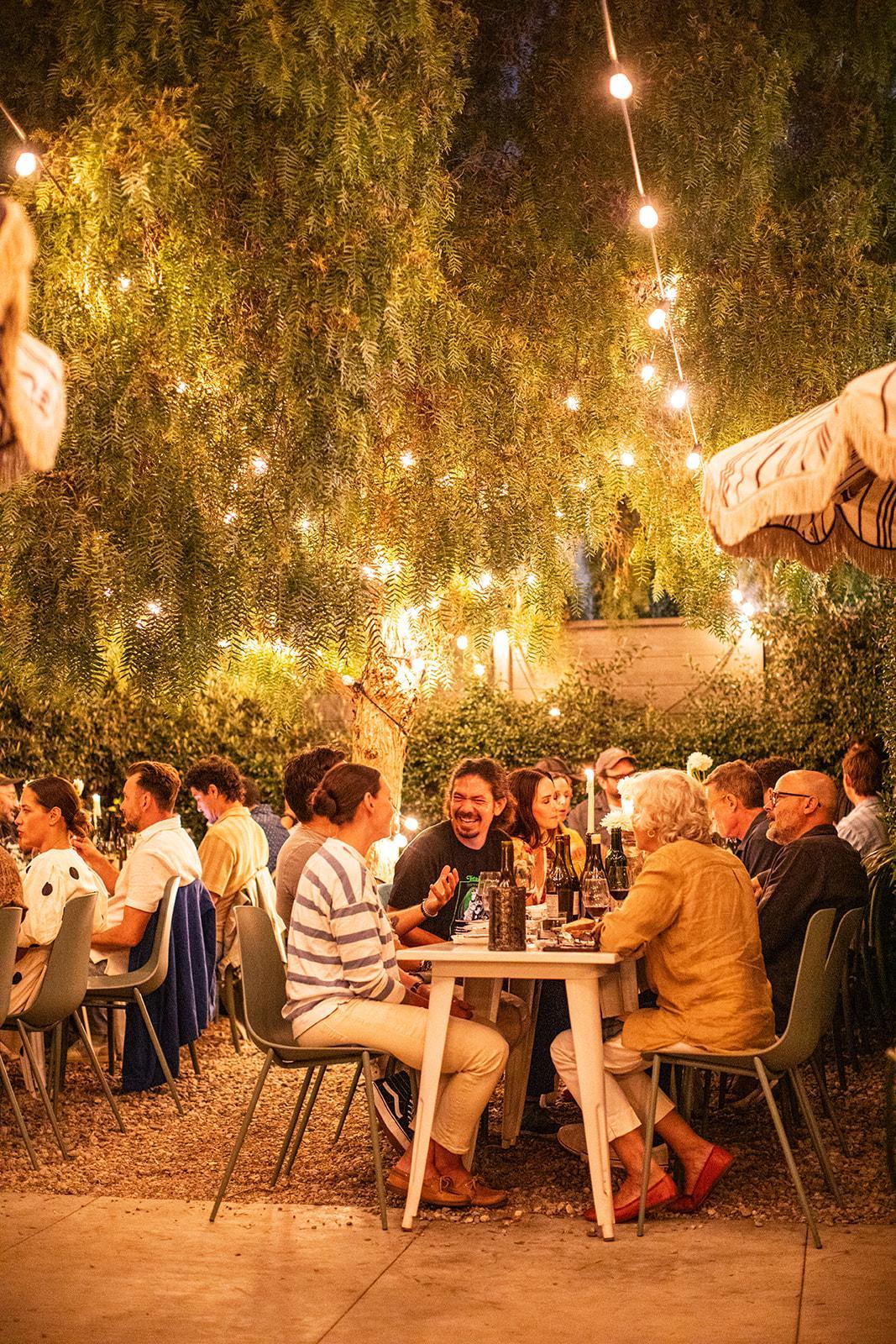 Buvons’ garden patio is thoughtfully divided into three distinct areas: a built-in bench lounge for relaxed gathering, a dining area set beneath our pepper tree, and an open space that allows guests to move freely throughout the garden. Framed by greenery and softly glowing string lights, the patio feels natural and unhurried, offering a warm, open-air setting that encourages ease, movement, and a seamless flow as the evening unfolds.