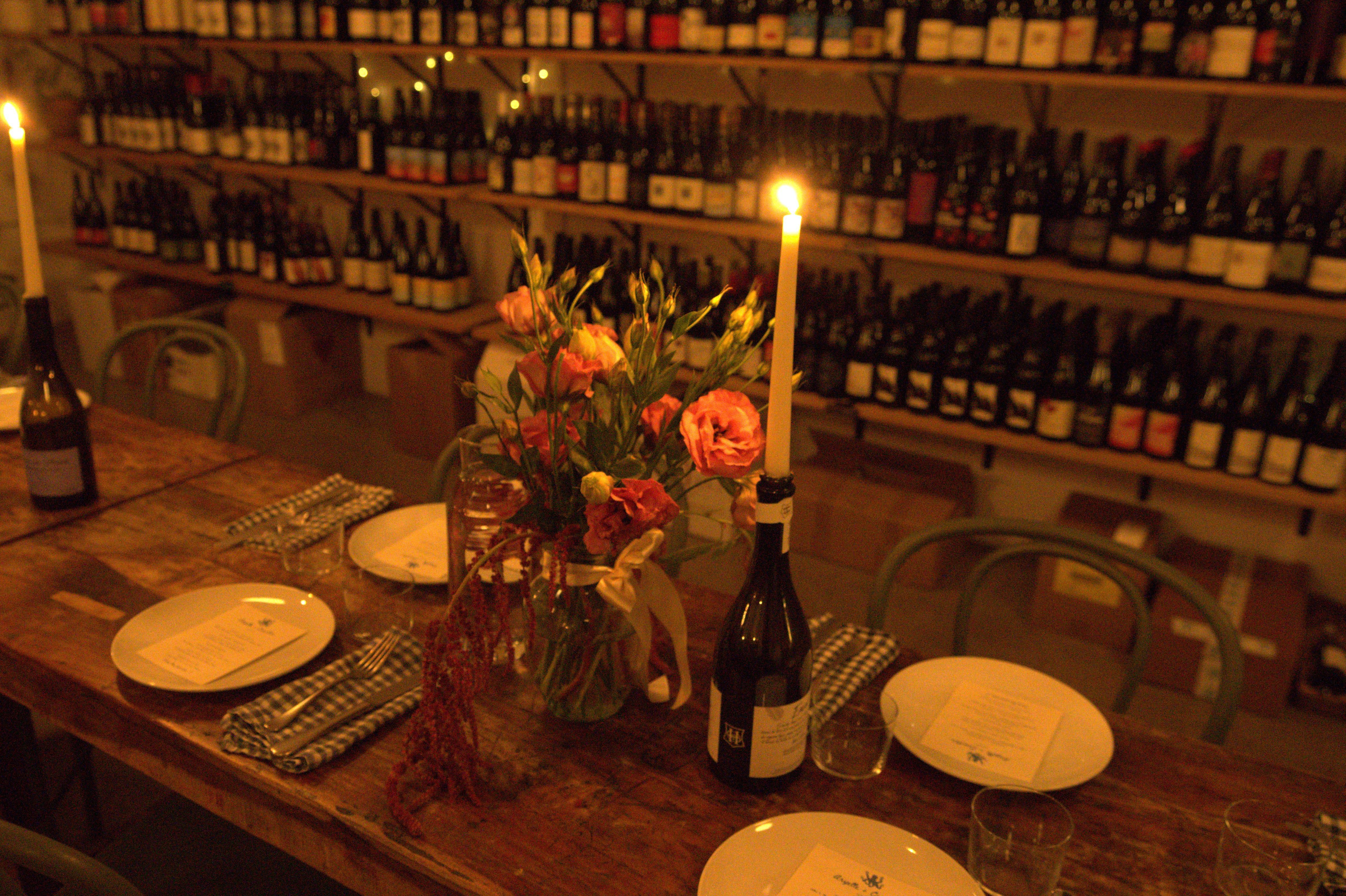 Buvons’ bottle-lined space is thoughtfully arranged with shelves of curated bottles and warm sound—making it well suited for intimate dinners or medium-sized standing gatherings. The space opens through doors to the shop patio, which can be included in the rental and allows events to flow easily between indoors and out. The atmosphere feels cozy and romantic, with soft lighting, vintage speakers, and a relaxed elegance that encourages lingering and conversation throughout the evening.