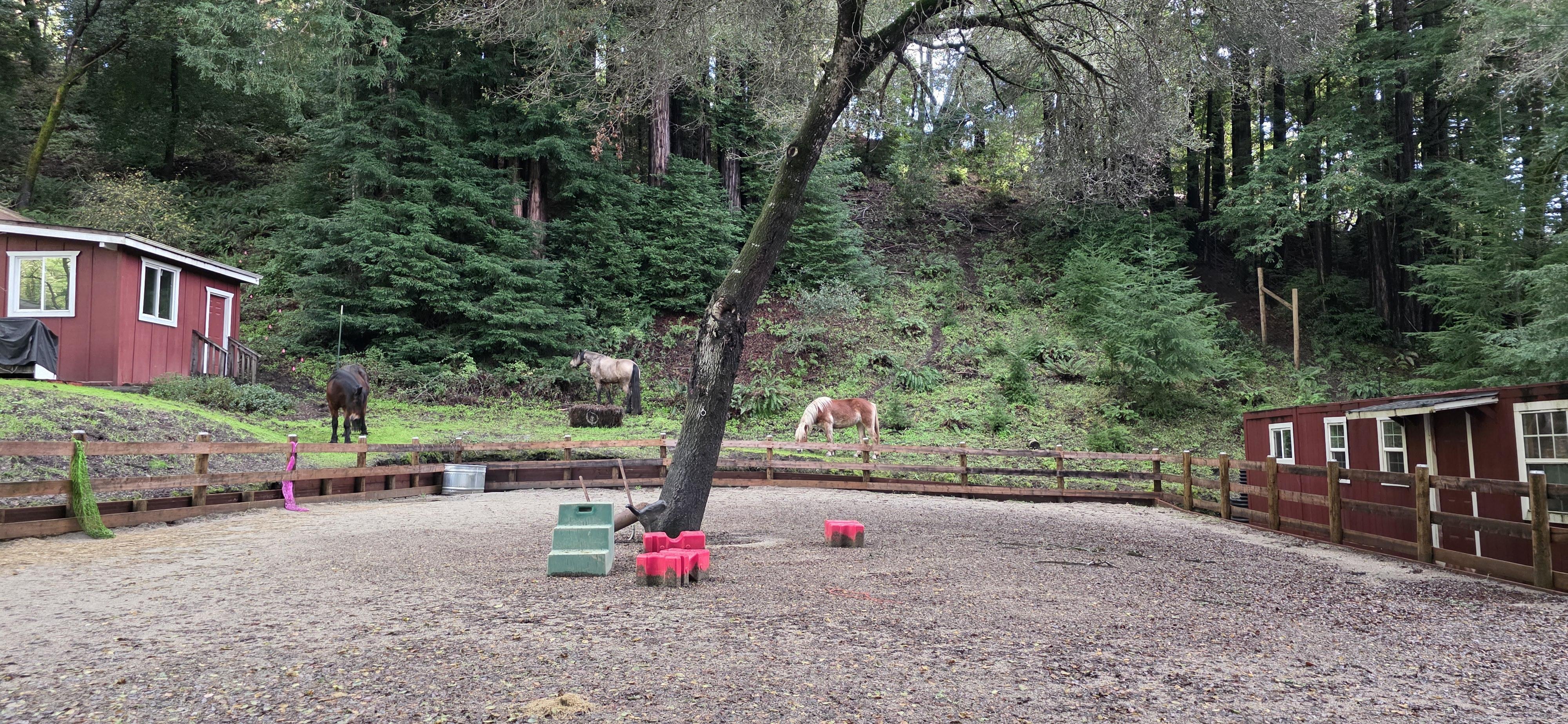 Sanded open-air arena suitable for ceremonies Redwood forest and oak tree backdrop Rustic barn surroundings Optional equestrian photo backdrop by arrangement Walkable access to nearby event spaces Host guidance to support flow, safety, and respectful use