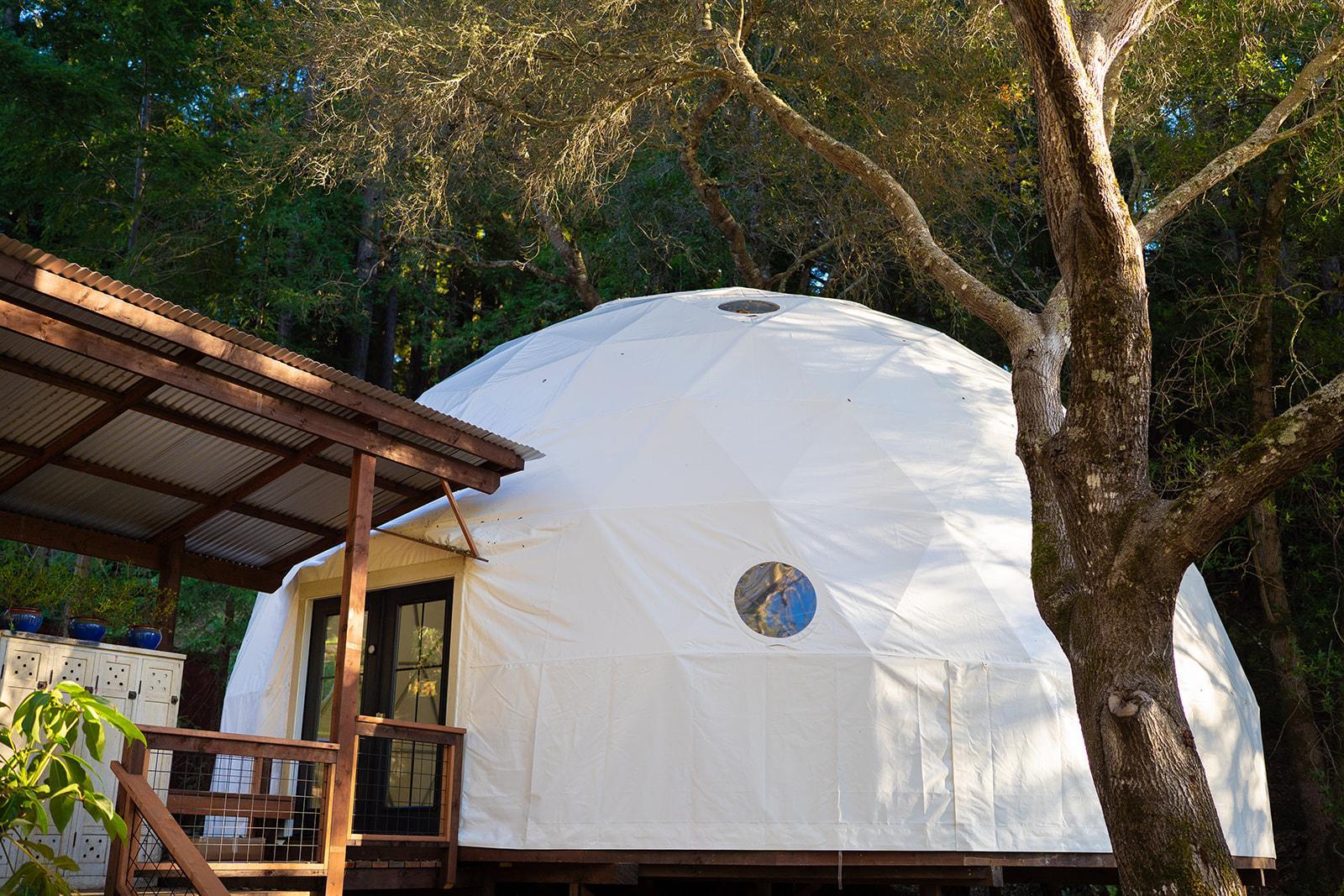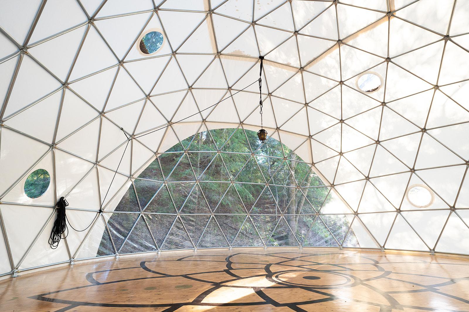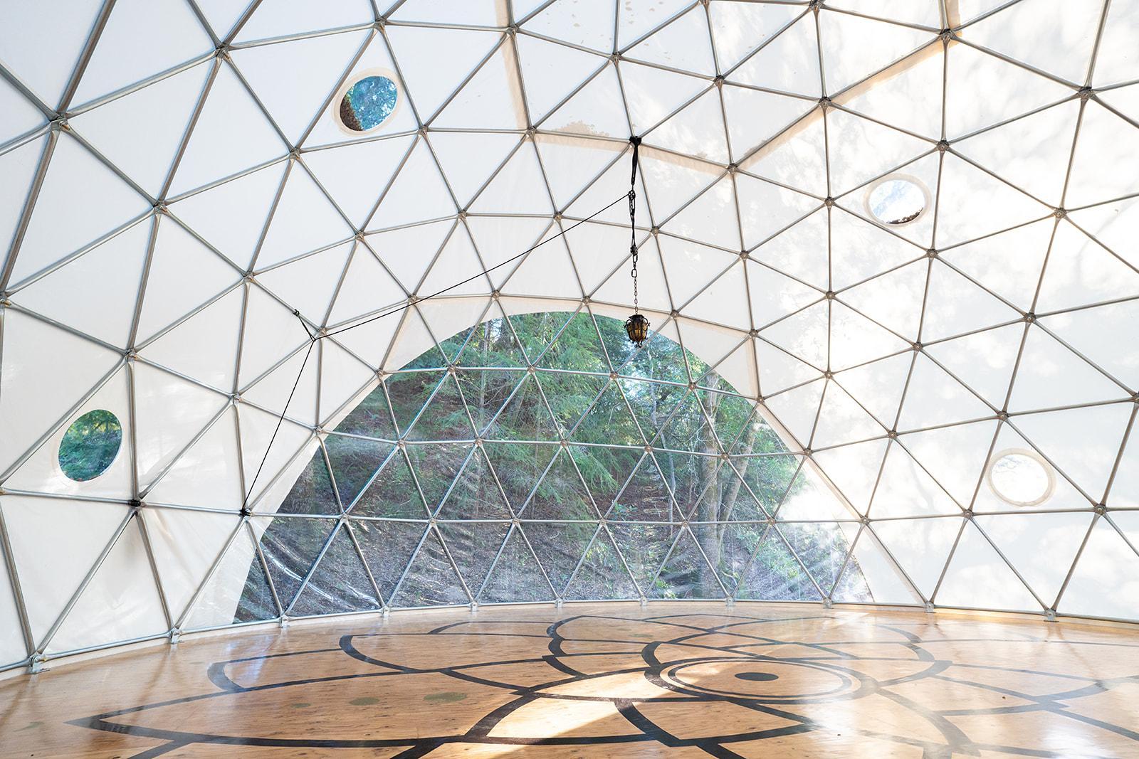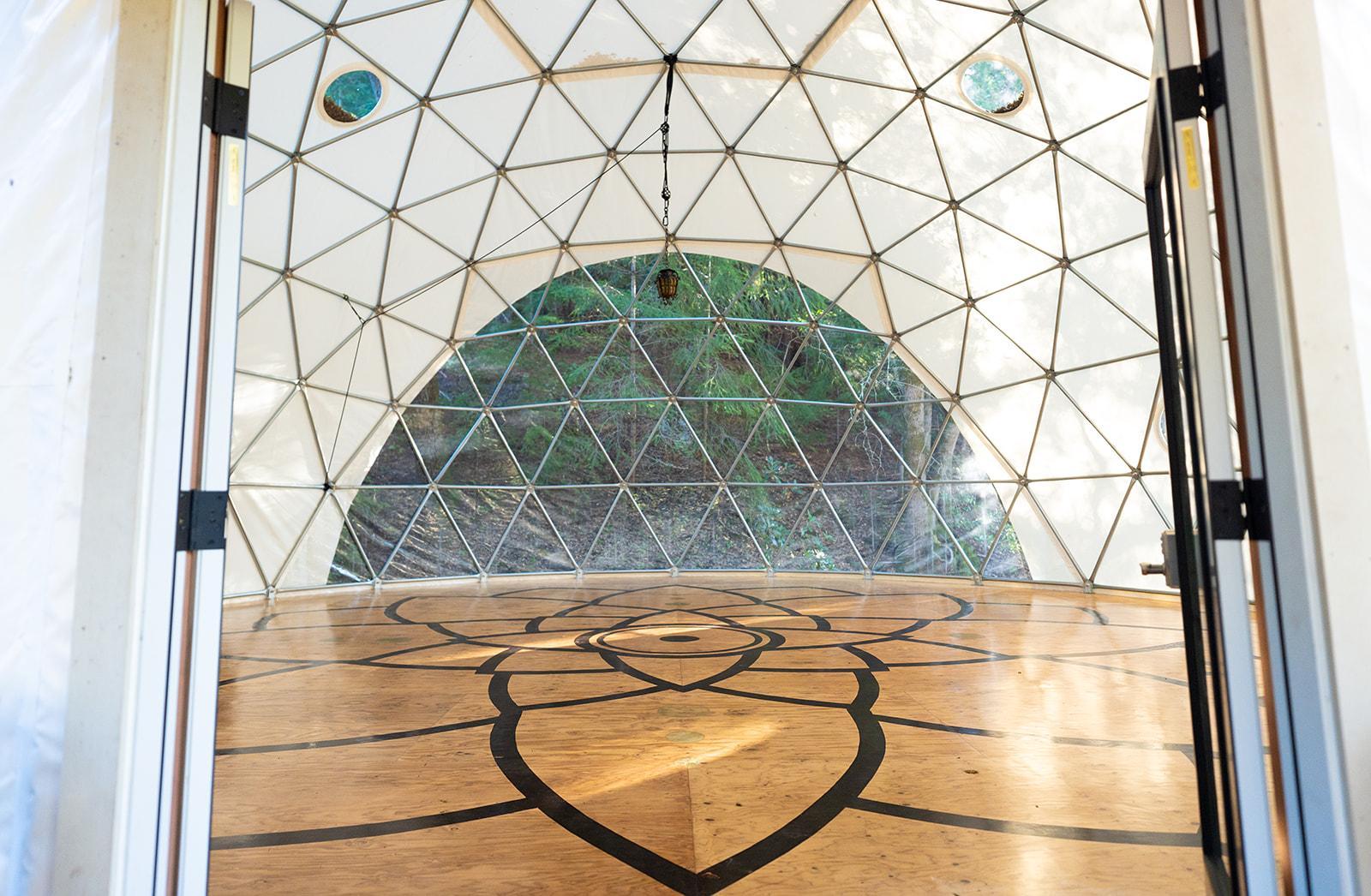 The Lotus Dome is a 36-foot geodesic dome, bathed in soft natural light and adorned with a hand-painted lotus mandala, the Dome offers a serene, acoustically rich setting for wedding ceremonies, elopements, and intimate gatherings. Its circular architecture creates a feeling of connection and presence, while nearby gardens provide space for reflection, photos, and quiet moments. The Dome is best suited for couples seeking a ceremony that feels grounded, meaningful, and held by nature.