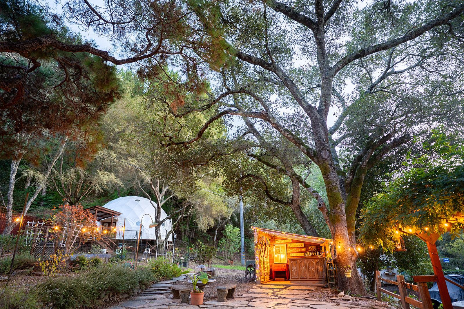 A grounded oak-shaded setting for ceremonies, camping, and nights under the stars.