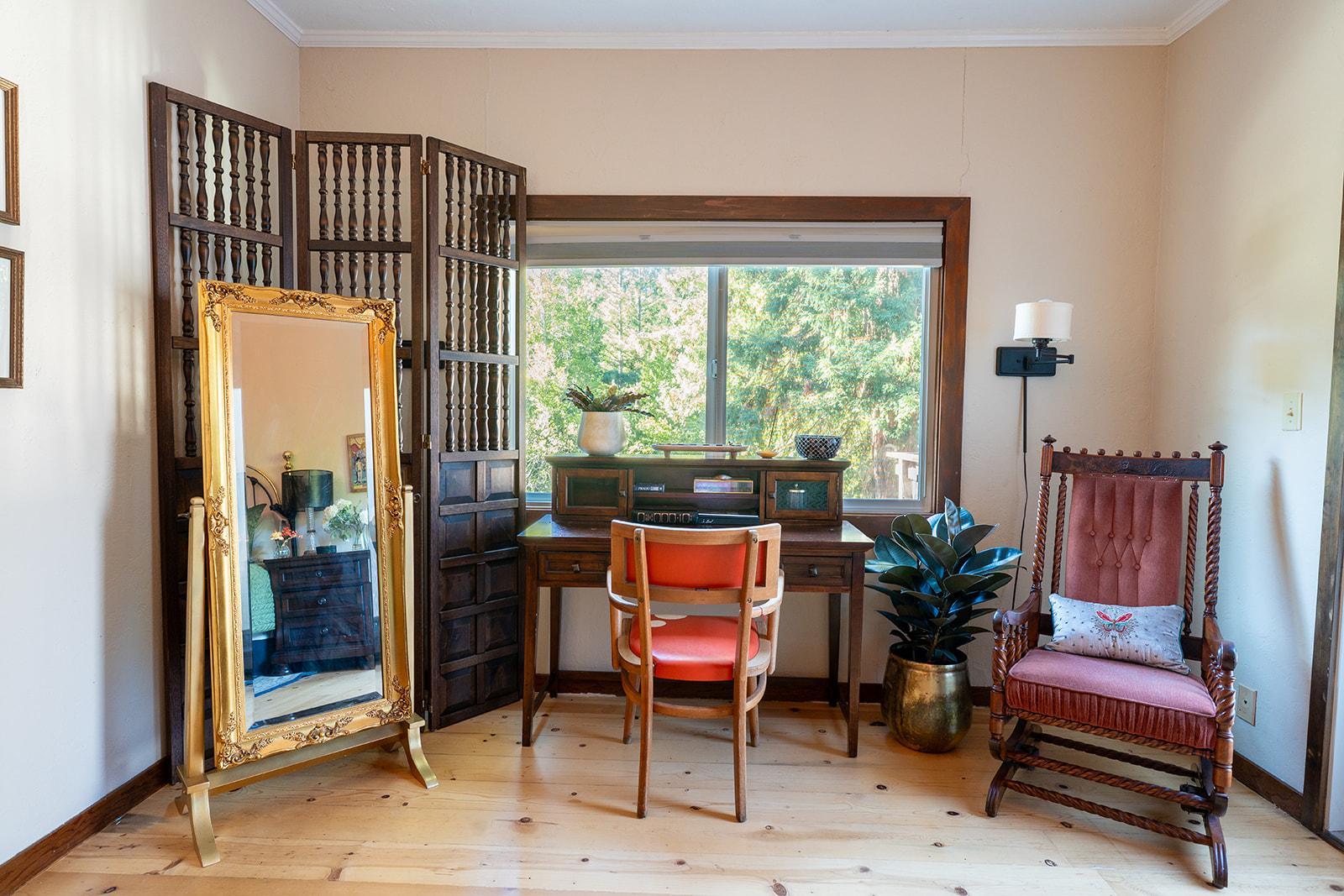 The Carriage House is a lovingly restored 1928 historic home designed for overnight guests and intimate private gatherings, the space features a warm, light-filled salon, formal dining room, full kitchen, and a spacious outdoor deck ideal for shared meals, cocktails, brunches, or quiet celebrations. With curated antiques, forest views, and a sense of timeless calm, the Carriage House is best suited for small, meaningful gatherings that value presence, conversation, and connection.