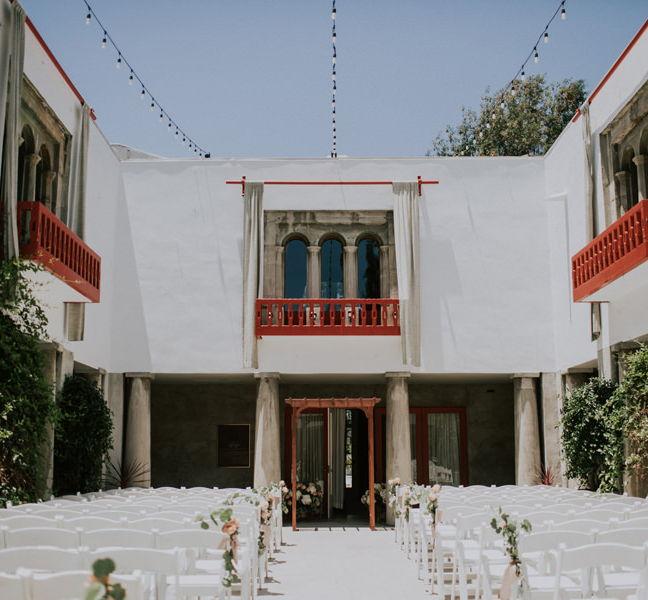 A romantic open-air courtyard framed by balconies, string lights, and timeless estate architecture.