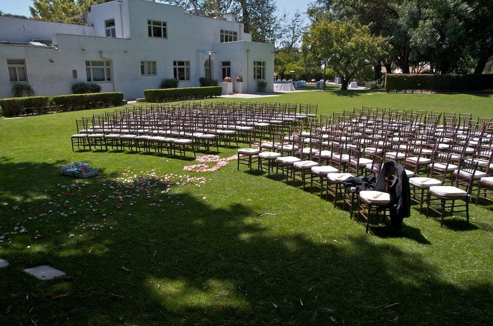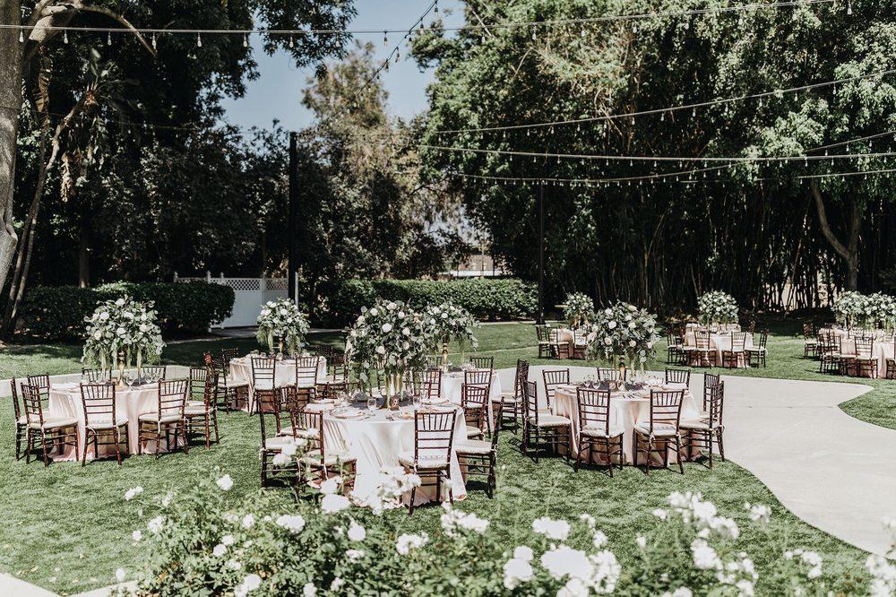 Experience the timeless elegance of the North Lawn, a premier outdoor destination for large-scale wedding receptions and events. This expansive green space is framed by the estate's historic architecture and meticulously manicured gardens, providing a picturesque backdrop for dining and dancing under the California sky. The area is versatile enough to accommodate a variety of layouts, including buffet stations and wedding party tables protected by classic white canopies. It is the perfect choice for couples seeking a sophisticated open-air setting that captures the grand scale of this historic Irving Gill-designed landmark.