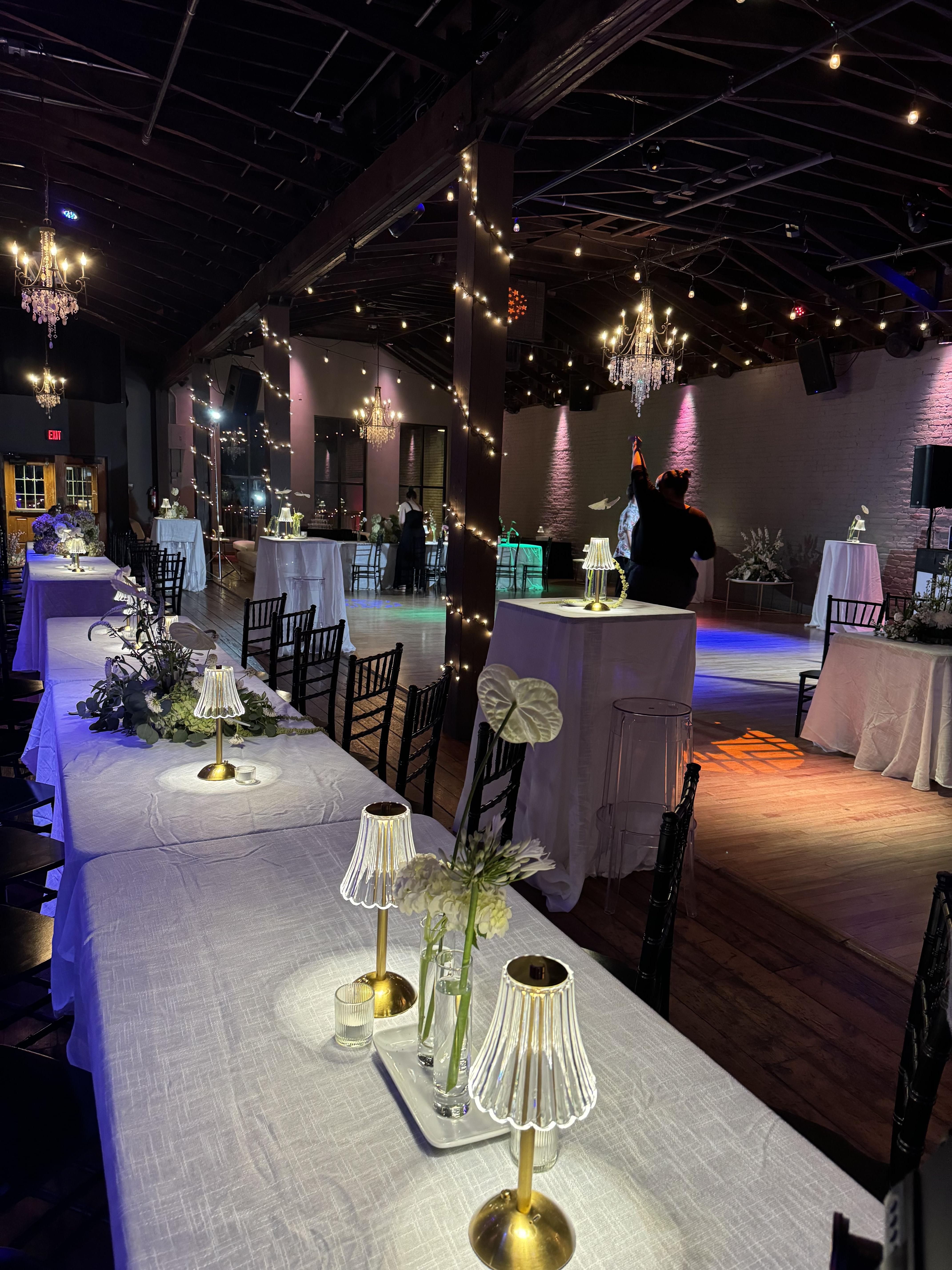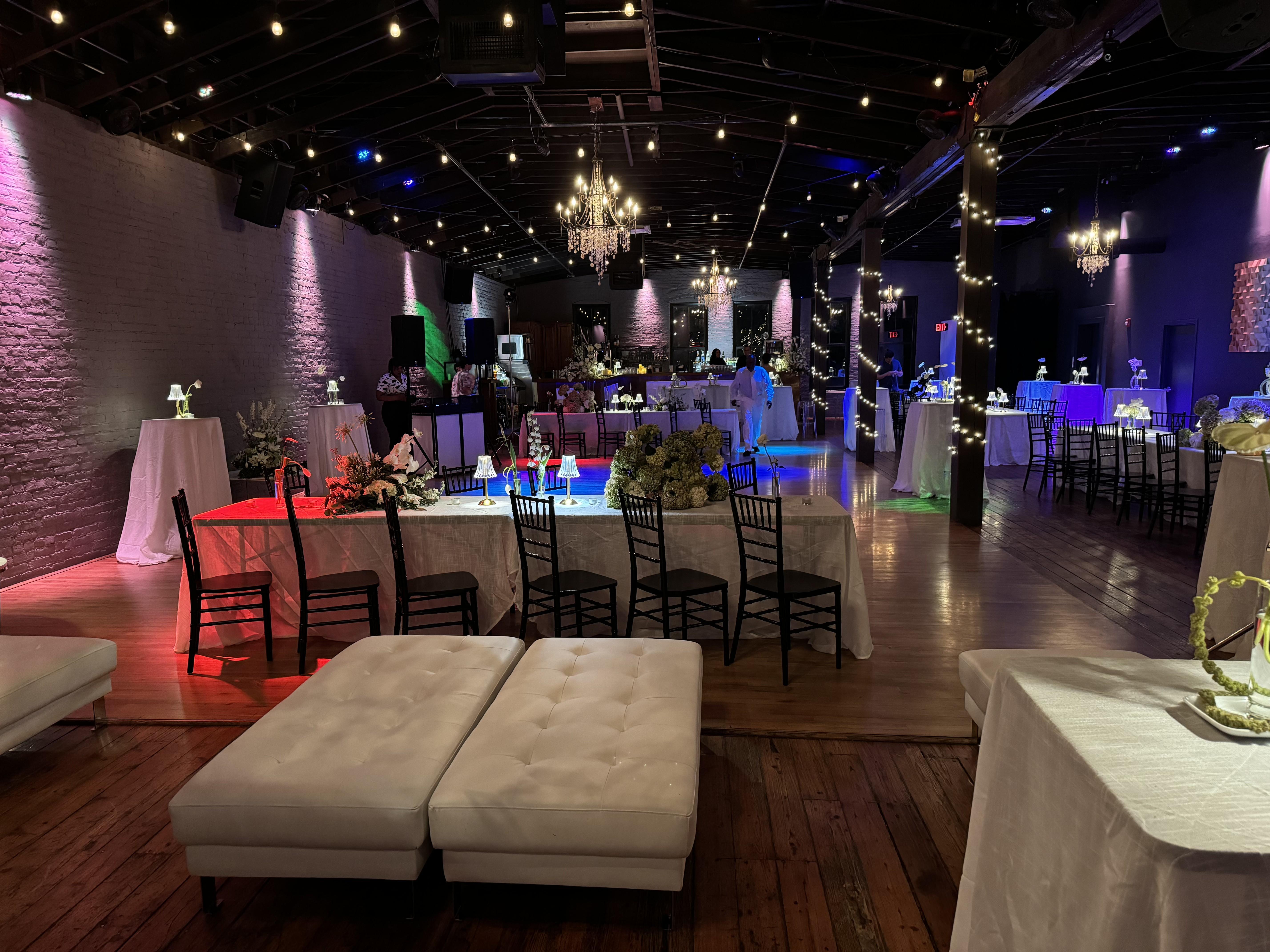 Club 27's main room has exposed brick walls, large windows that allow for natural light, and a spacious, open floor plan. The room is 3000 sq-ft, including a 1000 ft professional hardwood dance floor. The room features chic lighting fixtures and chandeliers, string lights, and sleek furnishings. This creates a luxurious ambiance without feeling overly formal.