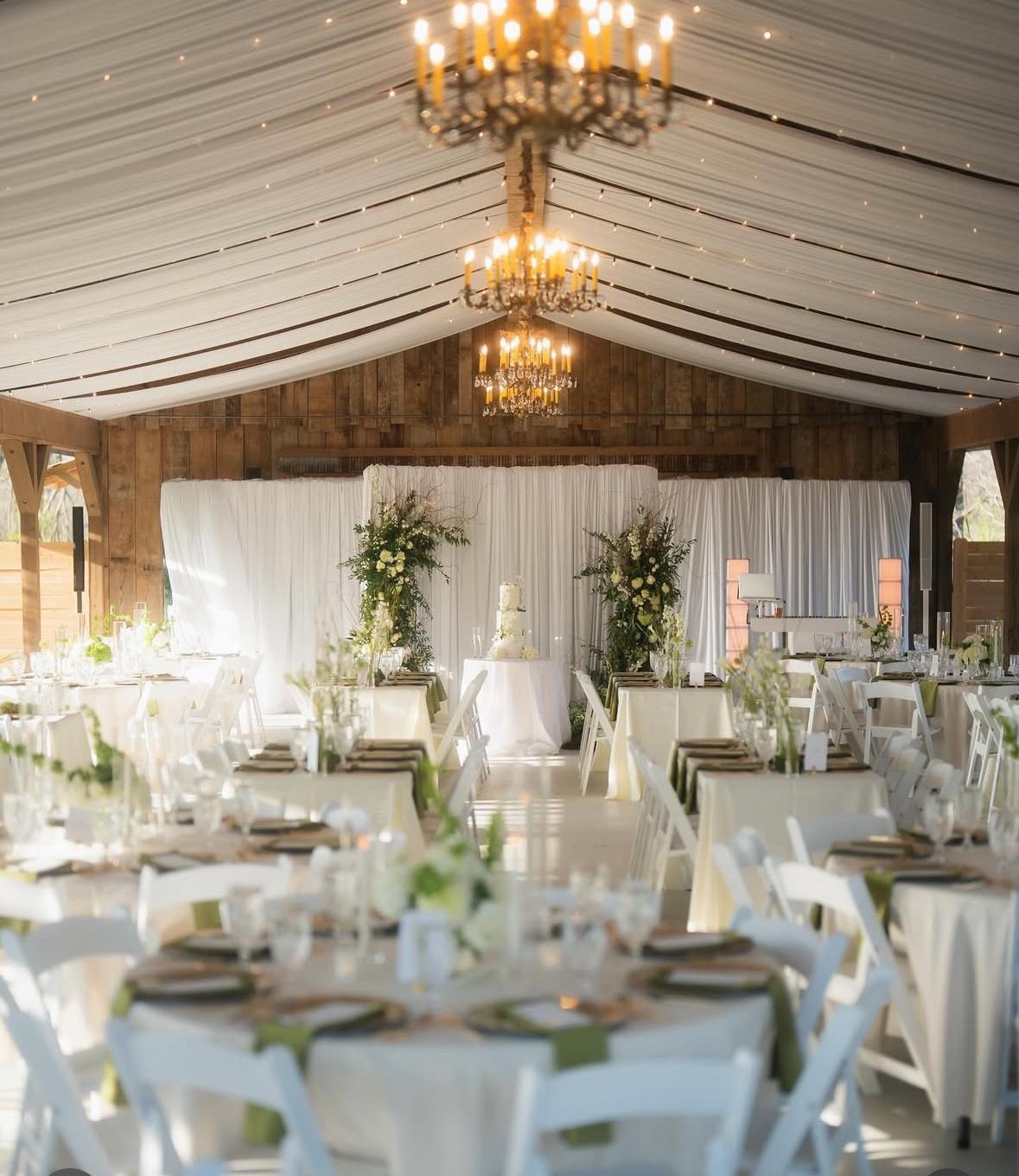Wooden beams draped with white fabric and beautiful chandeliers throughout.