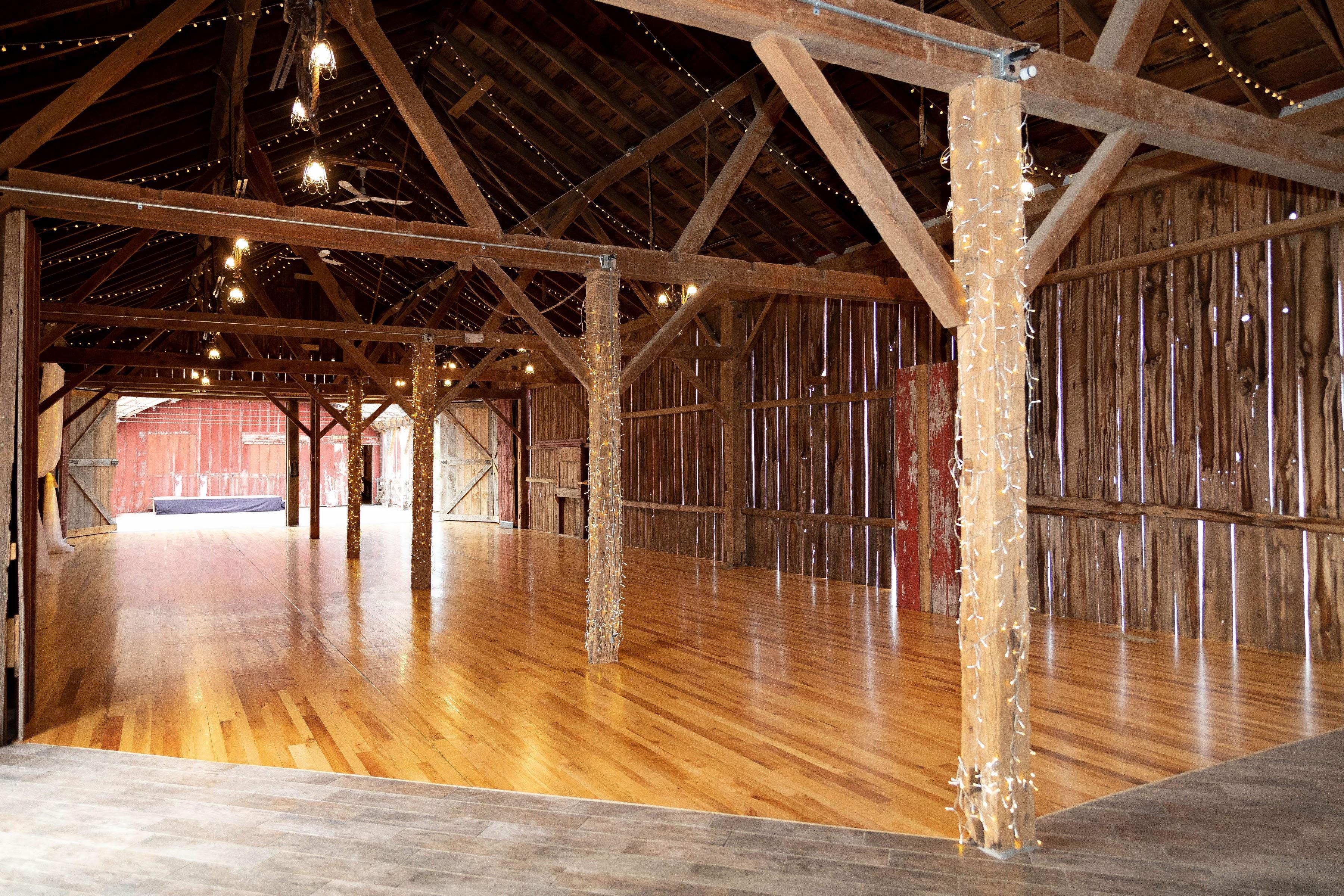 Celebrate across a versatile layout where two historic barns are joined by an elevated mezzanine bridge, offering panoramic views of the valley and fountain-fed pond. This unique architectural feature provides a stunning flow for ceremonies and receptions alike. For outdoor vows, the lush grounds by the water offer a tranquil, scenic backdrop. The venue includes a dedicated suite for pre-event preparation and the charming "Country Cottage"—a hand-built retreat tucked into the woods—available for overnight stays, ensuring a peaceful and immersive experience for you and your closest guests throughout the celebration.