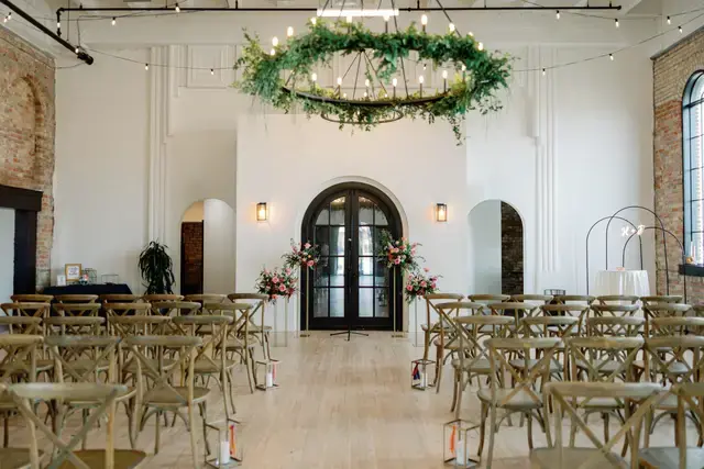 Crescent Hall's facility is characterized by soaring ceilings, exposed brick walls, tall arched windows, and romantic string lights.