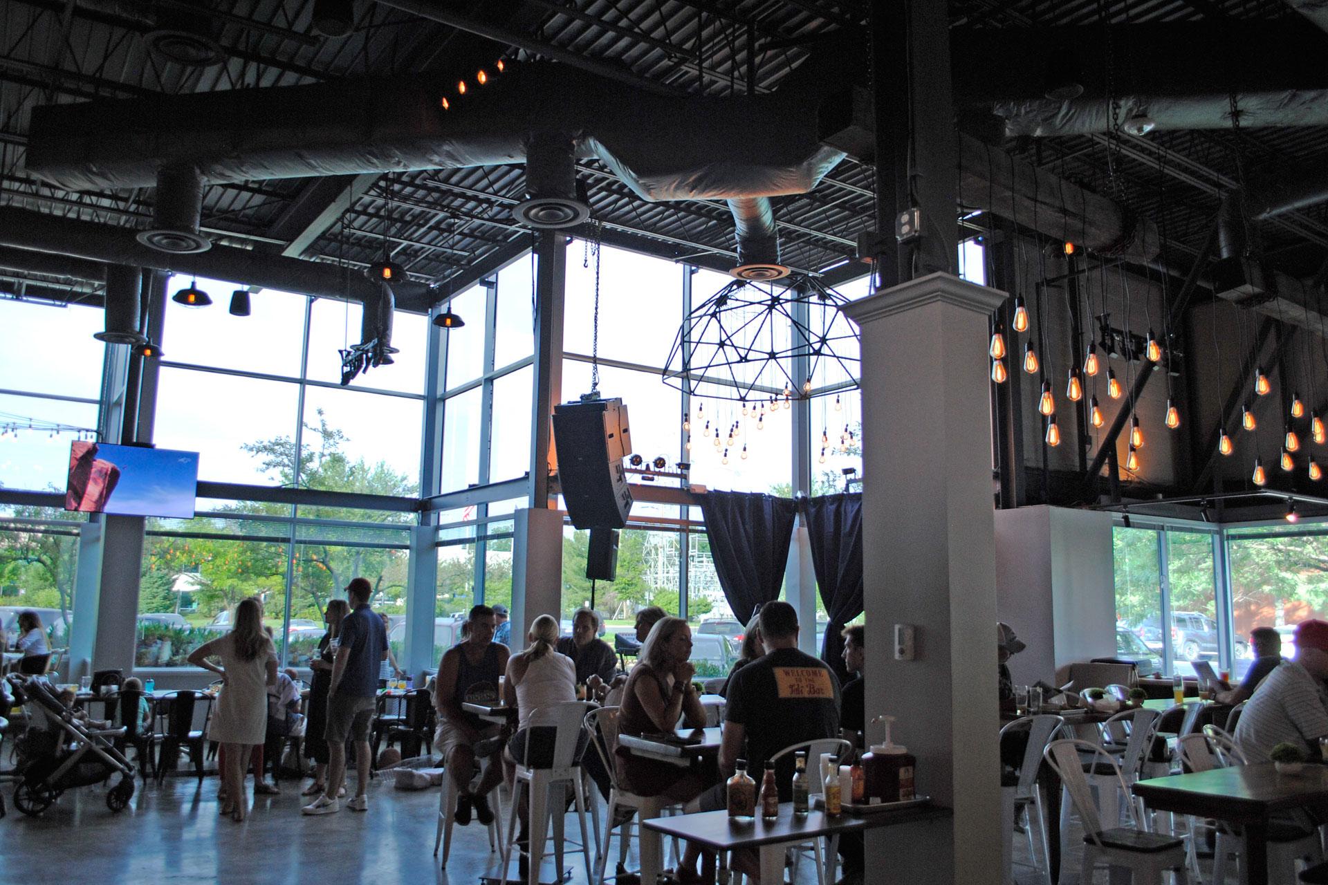 The aesthetic is a masterclass in modern industrial warmth. With its dark, exposed ceilings, reclaimed wood bar fronts, and rustic whiskey barrel high-tops, the room feels grounded and sturdy. Large-scale graphic murals and sleek digital tap lists add a contemporary edge, while the warm glow of pendant lighting keeps the expansive space feeling intimate and inviting. It’s the kind of room that feels equally suited for a high-energy welcome party or a relaxed, post-wedding brunch—a place where the craft of the beverage is matched only by the authenticity of the environment.