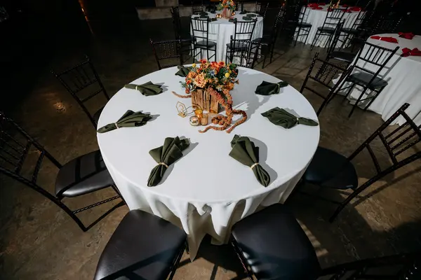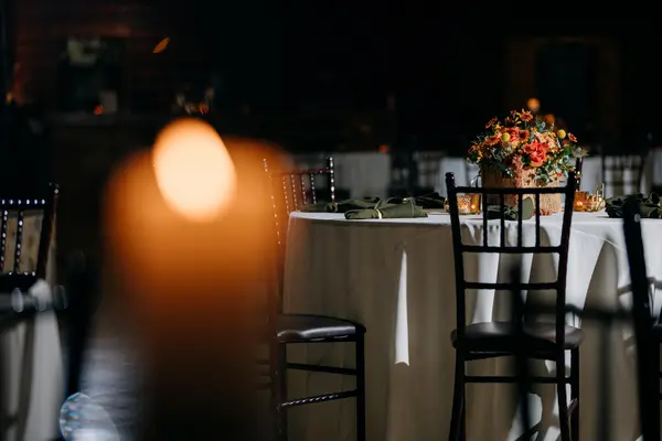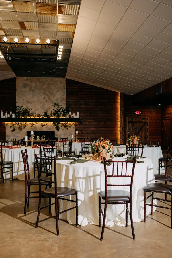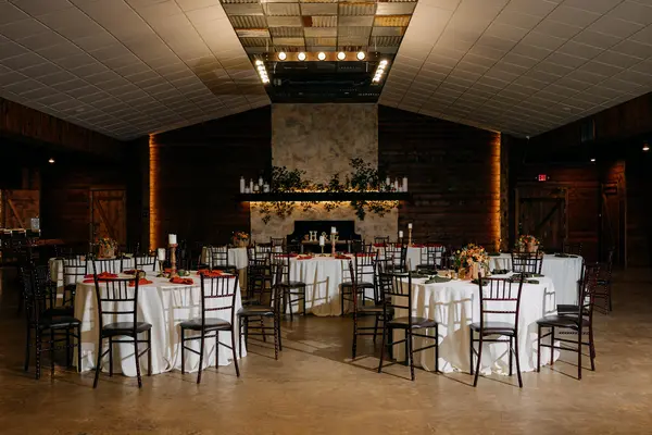 This space features 7,000 square feet of A/C and heated space. 60" round tables, farmhouse tables, and Mahogony Chiavari chairs fill the space. Ample space allows for guests to move freely, even when seated at capacity, and allows for a large dance floor. A built in bar, beverage station, 14'x20' stage, wood burning fireplace, prep kitchen, and buffet area complete the space. A covered porch is attached for guests to easily enter and exit the reception space.
