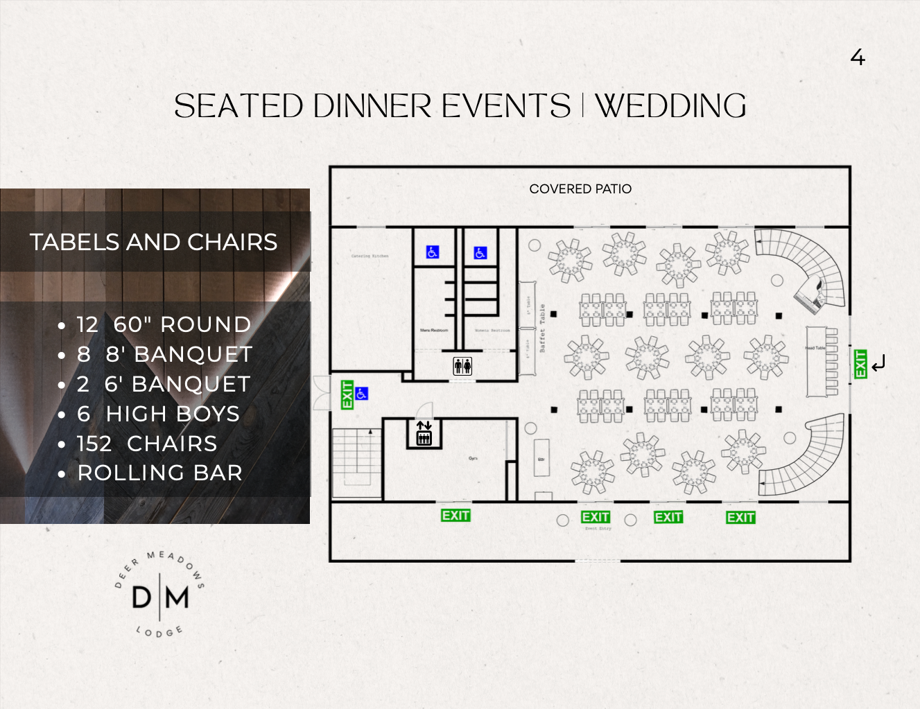 The Lodge’s main event space features 4,000 square feet of beautifully designed interior space. The space accommodates up to 150 guests seated indoors, with the option to expand to up to 180 seated guests when utilizing the heated, covered patio, offering a seamless indoor-outdoor flow year-round. This versatile space is thoughtfully designed to host elevated celebrations while remaining welcoming, functional, and timeless.