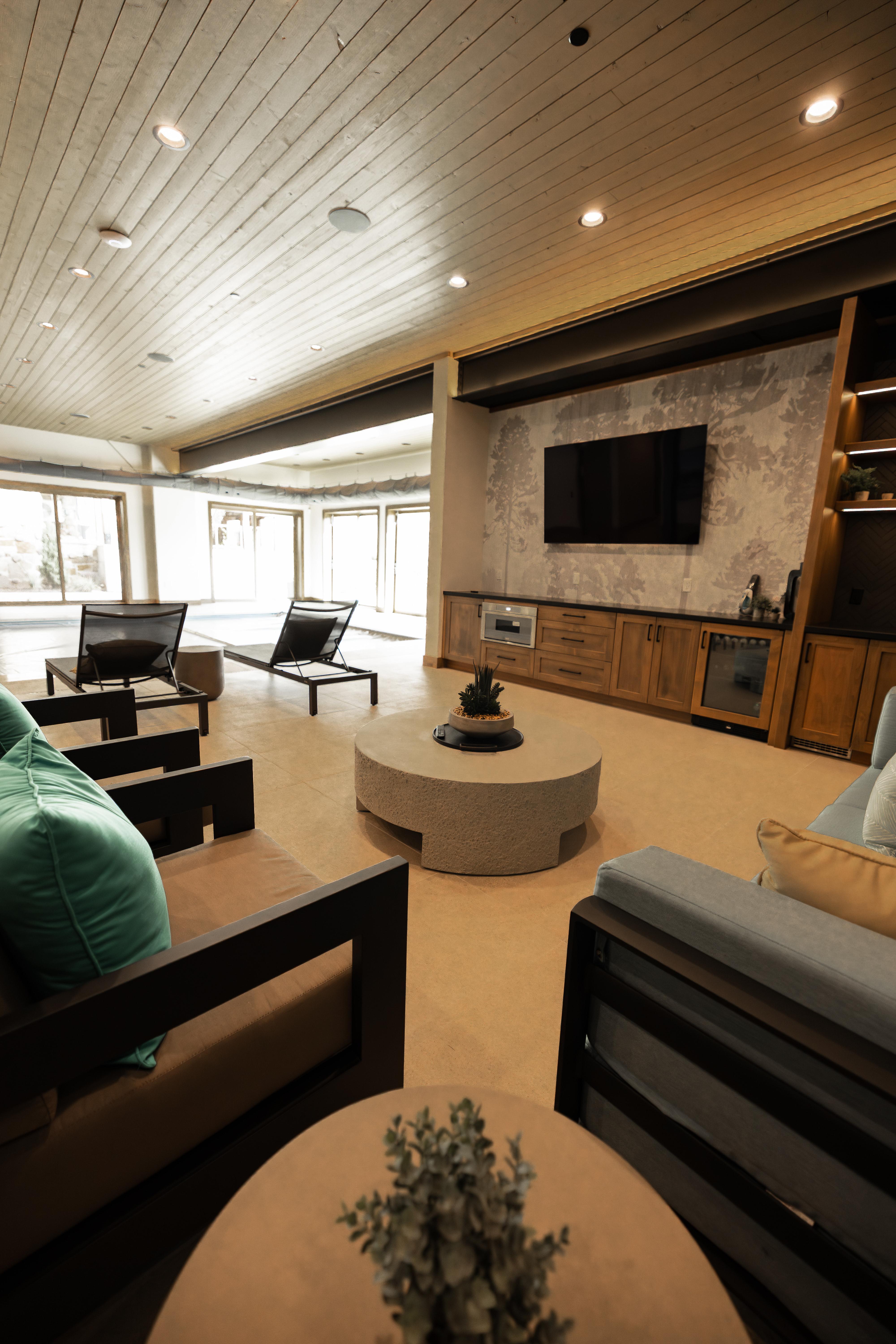 The Pool Lounge & Sauna offers a laid-back retreat for guests to relax and connect. Featuring an indoor pool, hot tub, infrared sauna, and a casual lounge with an air hockey table, this space blends wellness and play in a serene mountain setting—perfect for downtime, welcome gatherings, or post-event relaxation.