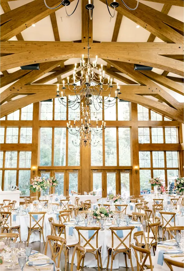 The lodge is filled with rustic touches that provide the perfect backdrop for weddings, both large and small. Couples can invite up to 200 of their friends and family. Donovan Pavilion is filled with dramatic features, such as towering windows and arched beam ceilings. Detailing, like etched glass windows, lends an elegant touch. Couples are welcome to exchange their vows in the lodge or out on the back patio. There is also plentiful space in the 5,200-square-foot Pavilion for couples to use during their ceremony or reception.