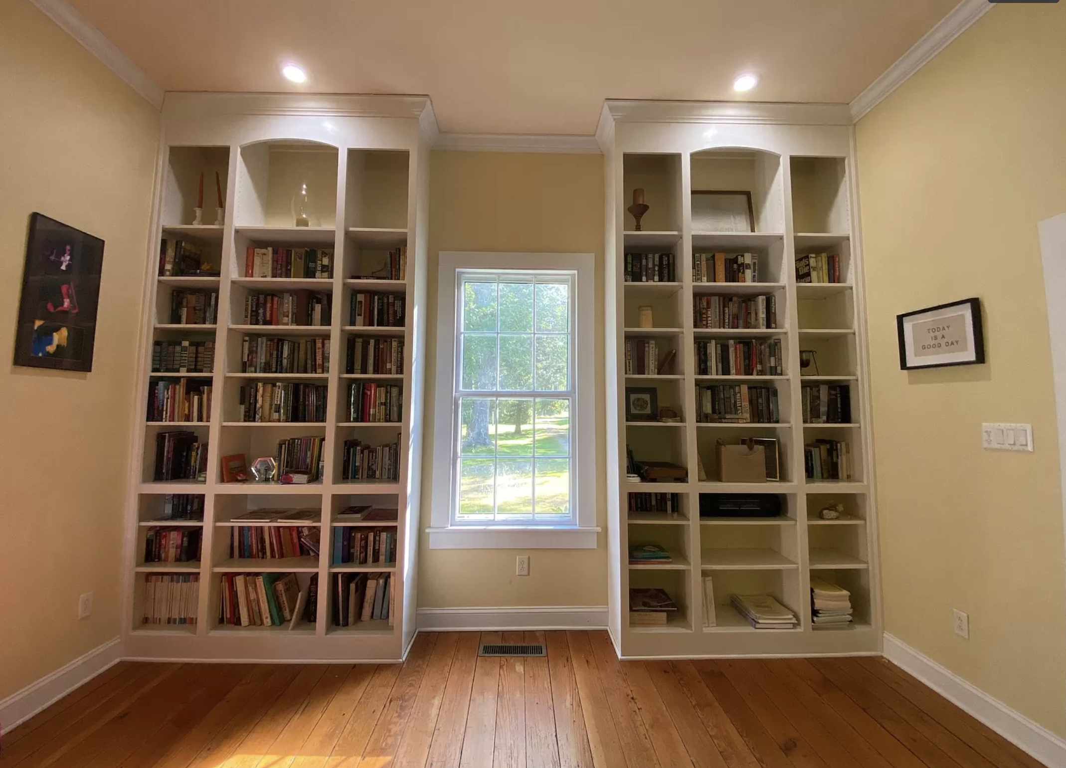 A beautiful historic room with very high, period ceilings with original hardwood floors from just after the Civil War.