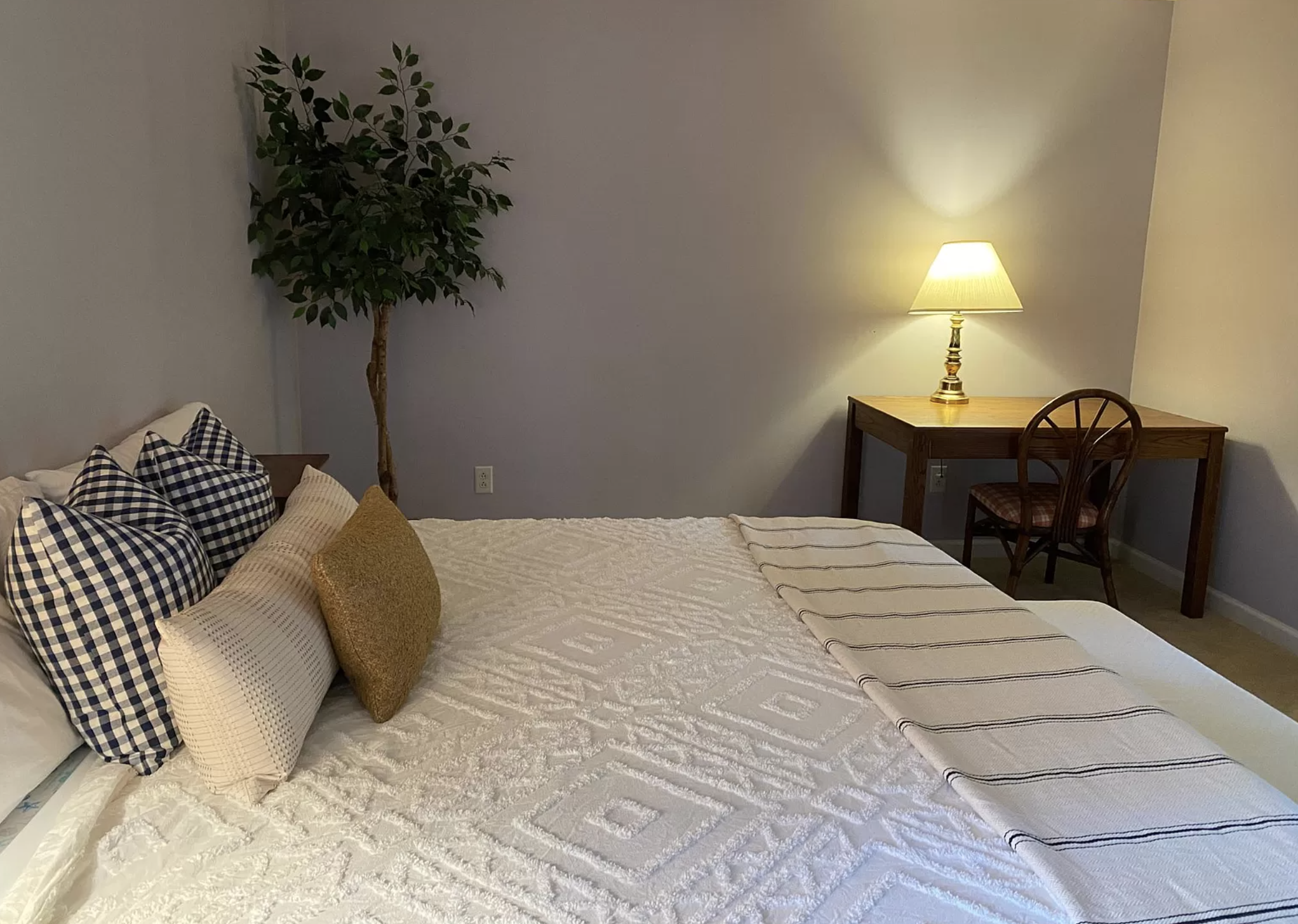 -King-size bed -Oak desk w/ extra rattan chairs for seating -Arm chair -Closet