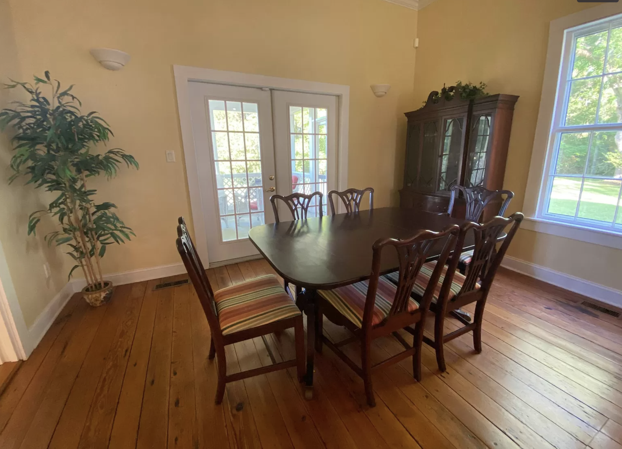 -recessed lighting -lots of natural light -8 gold Chivari chairs -one long outdoor table that can seat at least 10 -2 antique wicker end chairs -antique wicker sofa and coffee table -gas fireplace -antique dining table and chairs, which seats 6 -long antique serving table / additional dining table -moveable, light burgandy sofa and two end chairs for seating area -windows that look out onto countryside and farm