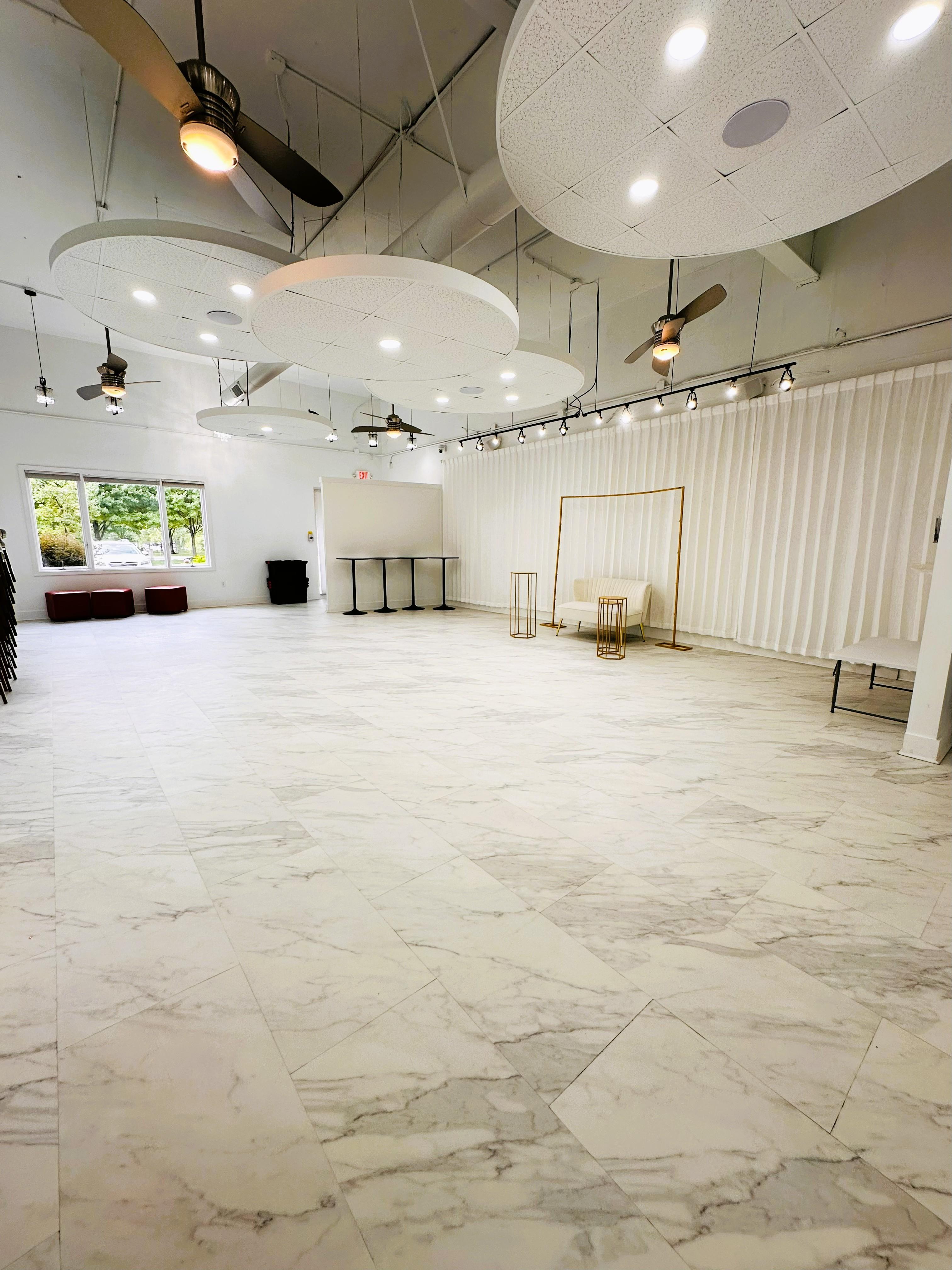 This high ceiling space and white floors with tables and chairs, accompanied by mirror wall covered with beige or white linen highlights all the event colors and brings out smiles and giggles from guests.