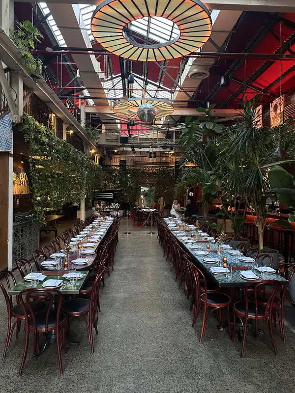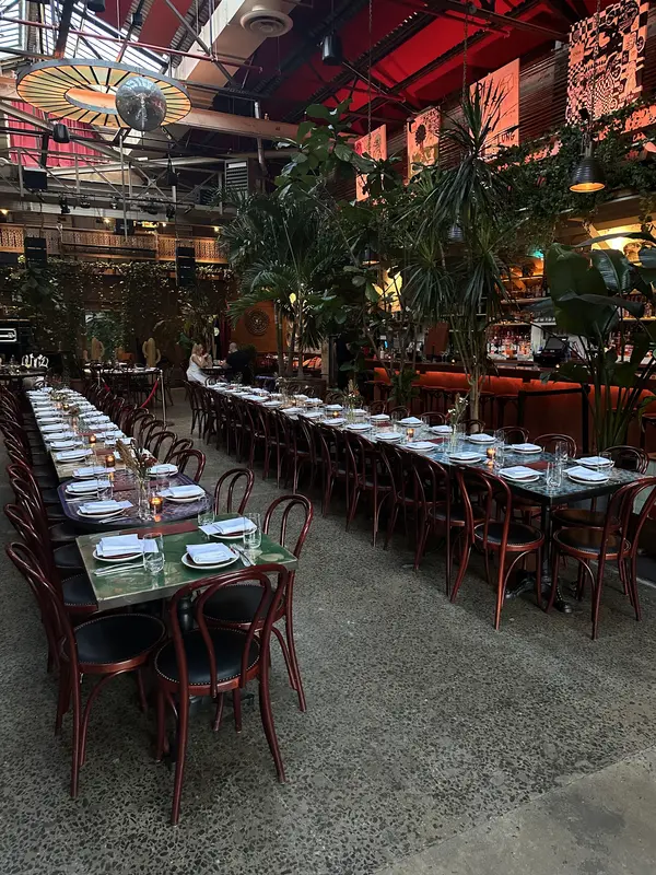 Open plan flexible floor seating Floor to ceiling garage door entrance Acoustic ceilings with glass skylight Brick - fire oven and pizza kitchen Antique mosaic tile tables Dyphor living room space (ever changing) Floresta botanical shop DJ Booth and stage Main bar with 26 seats Lush greenery
