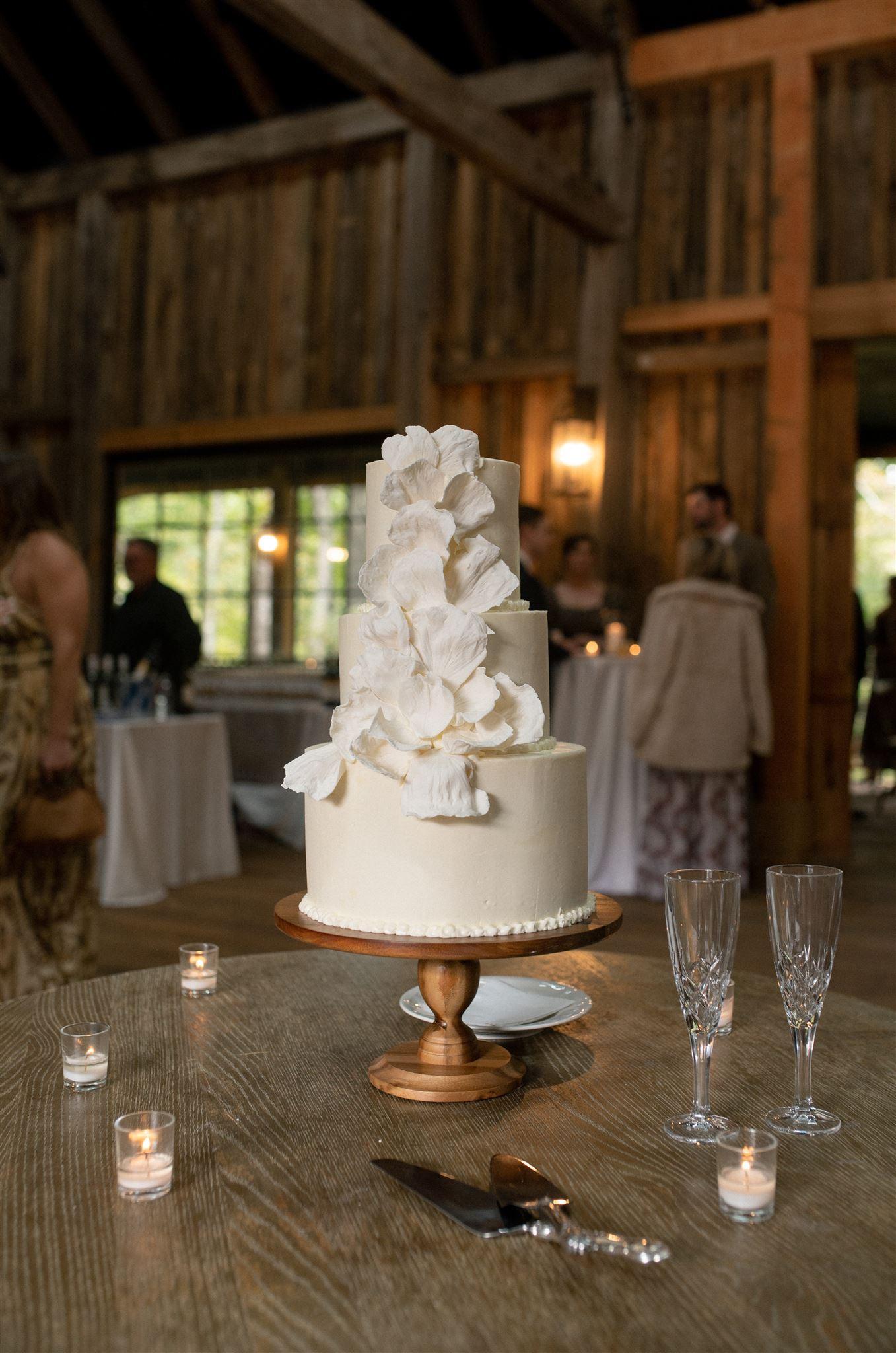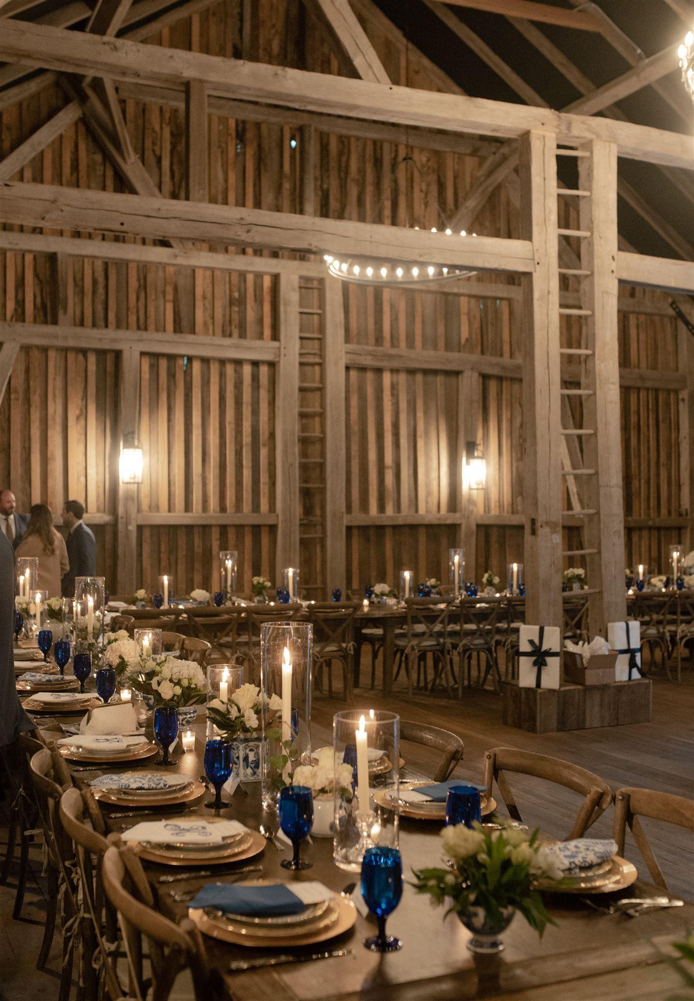 The vintage Amish barn was brought down from Pennsylvania and reconstructed here on-site decades ago. Owners, Margaret and Chris Shutze, recently modernized the venue with a large stone fireplace that is the focal point of the room. The large industrial windows and expansive covered deck overlooks the rhododendron forest. The space features four (4) beautifully appointed powder rooms for guest use.