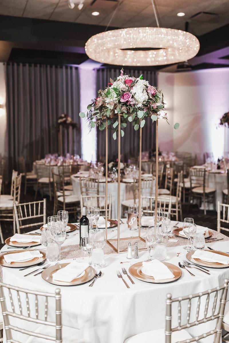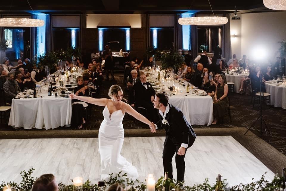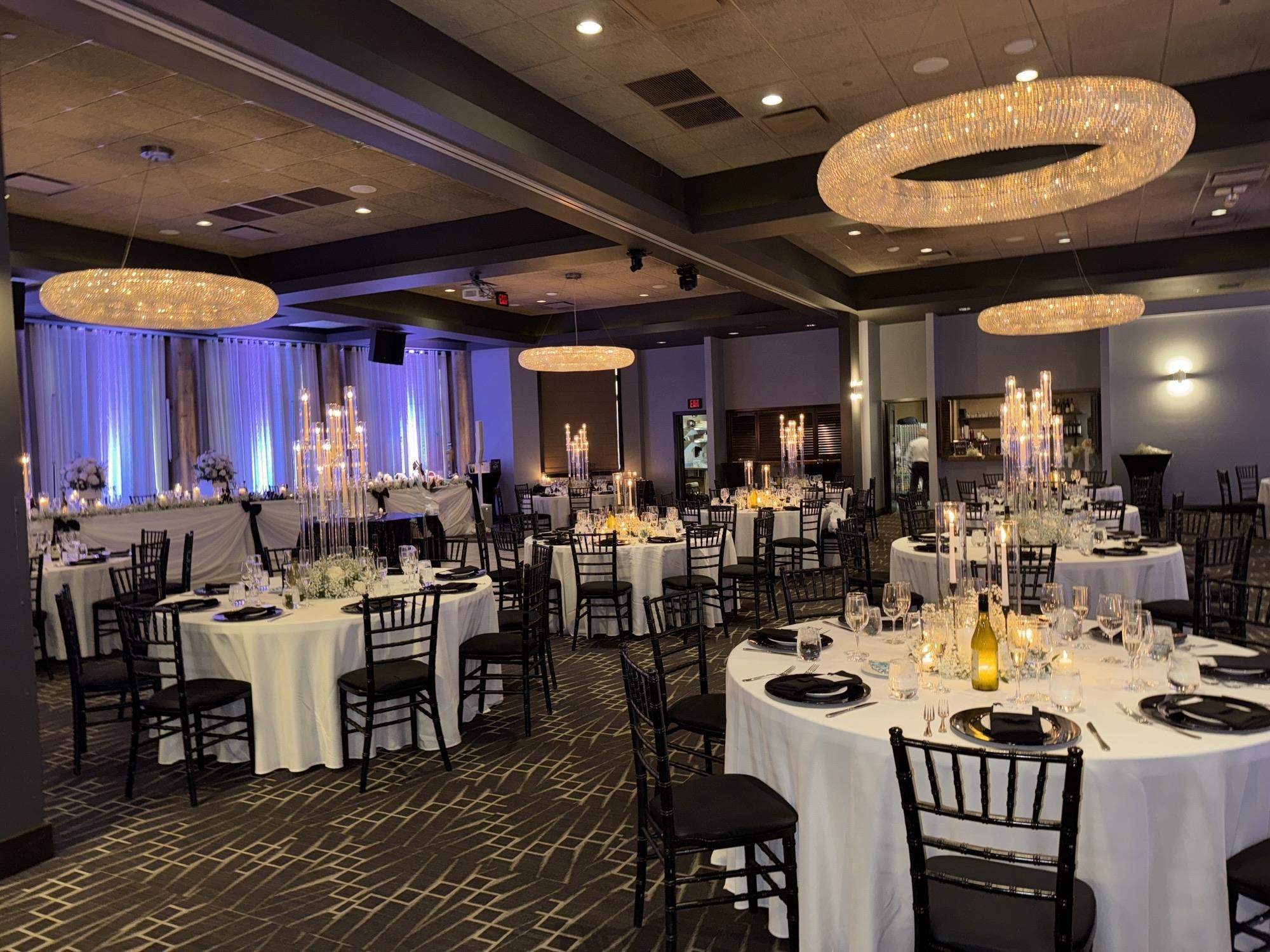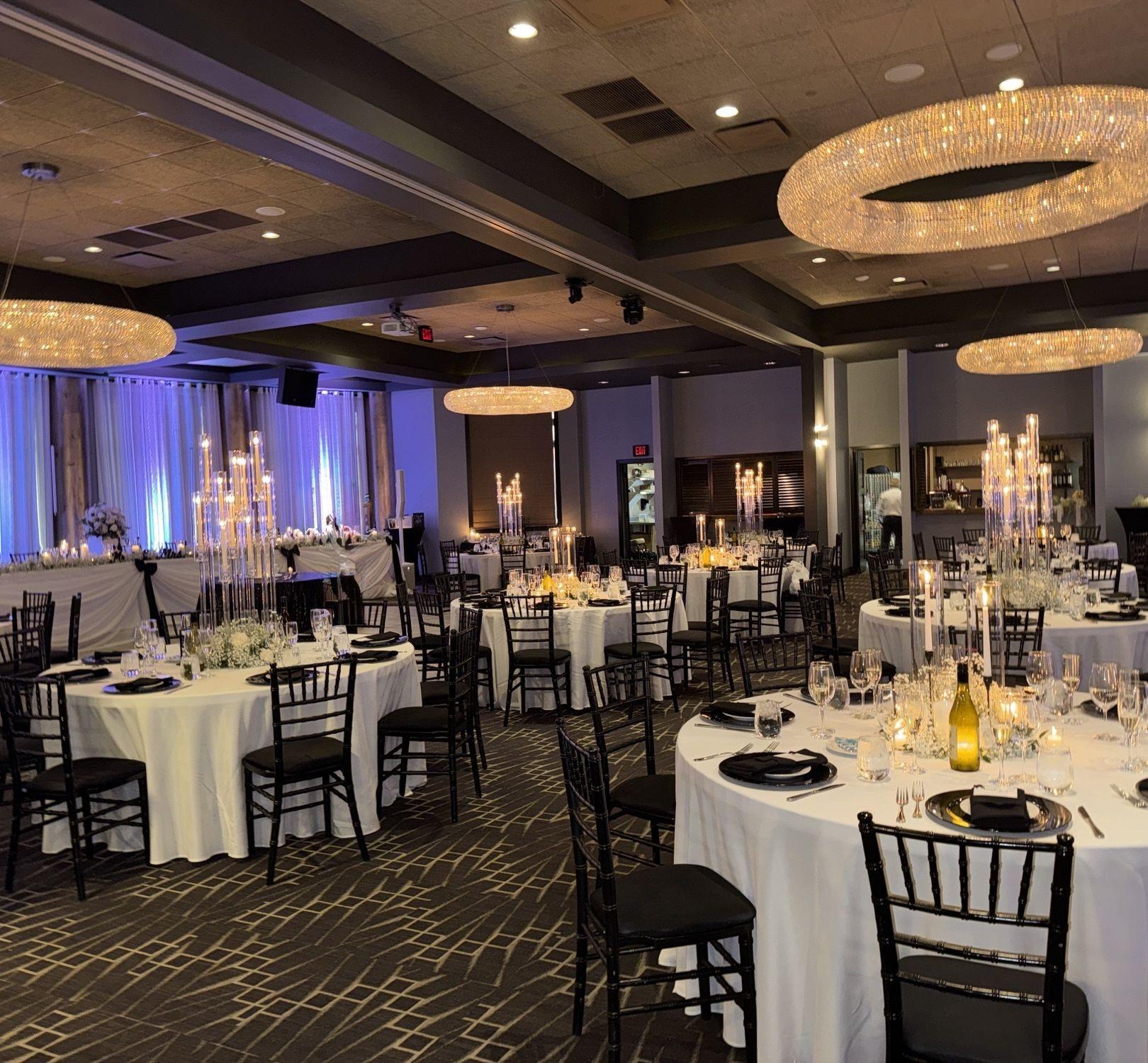 Our stunning venue offers a refined, modern ballroom designed for elegant and unforgettable celebrations. Featuring crystal chandeliers, custom uplighting, 2 bars in the room, audio visual equipped, linens of many different colors, premium drapery, DJ booth, and a built in dance floor, creating a refined ambiance where every detail feels elevated and every celebration