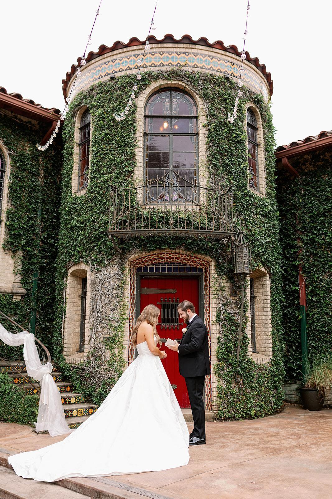 The courtyard is perfect for pre-wedding gatherings and casual receptions and also shines as a ceremony space for up to 100 guests. Its charm lies in its elegant curved staircase, vibrant tiled steps, and lush evergreen vines covering the walls, creating a magical atmosphere. With an outdoor fireplace, an elevated platform, and stained glass windows overlooking the courtyard, it's a captivating oasis, accommodating up to 60 guests for intimate receptions or rehearsal dinners.