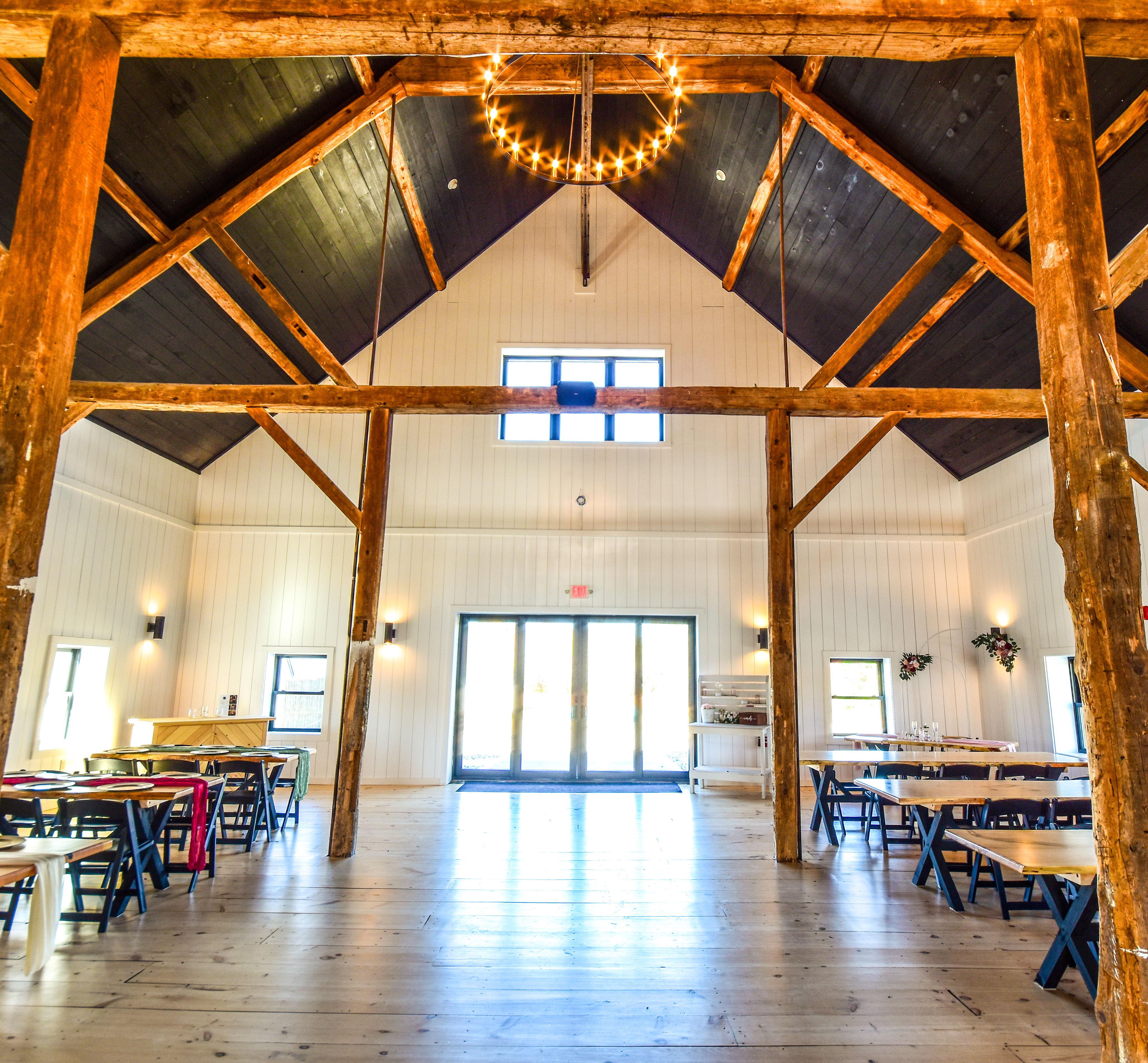 Step into a piece of history within this beautifully restored 1790s barn, where rustic heritage meets contemporary sophistication. The interior radiates a warm, inviting atmosphere highlighted by original exposed beams and rich pine flooring, creating a timeless backdrop for any celebration. Handcrafted local tables and sleek modern chairs complement the aged wood aesthetic, while full climate control and a state-of-the-art audio-visual system ensure your guests remain comfortable as they dance the night away in this architecturally stunning space.