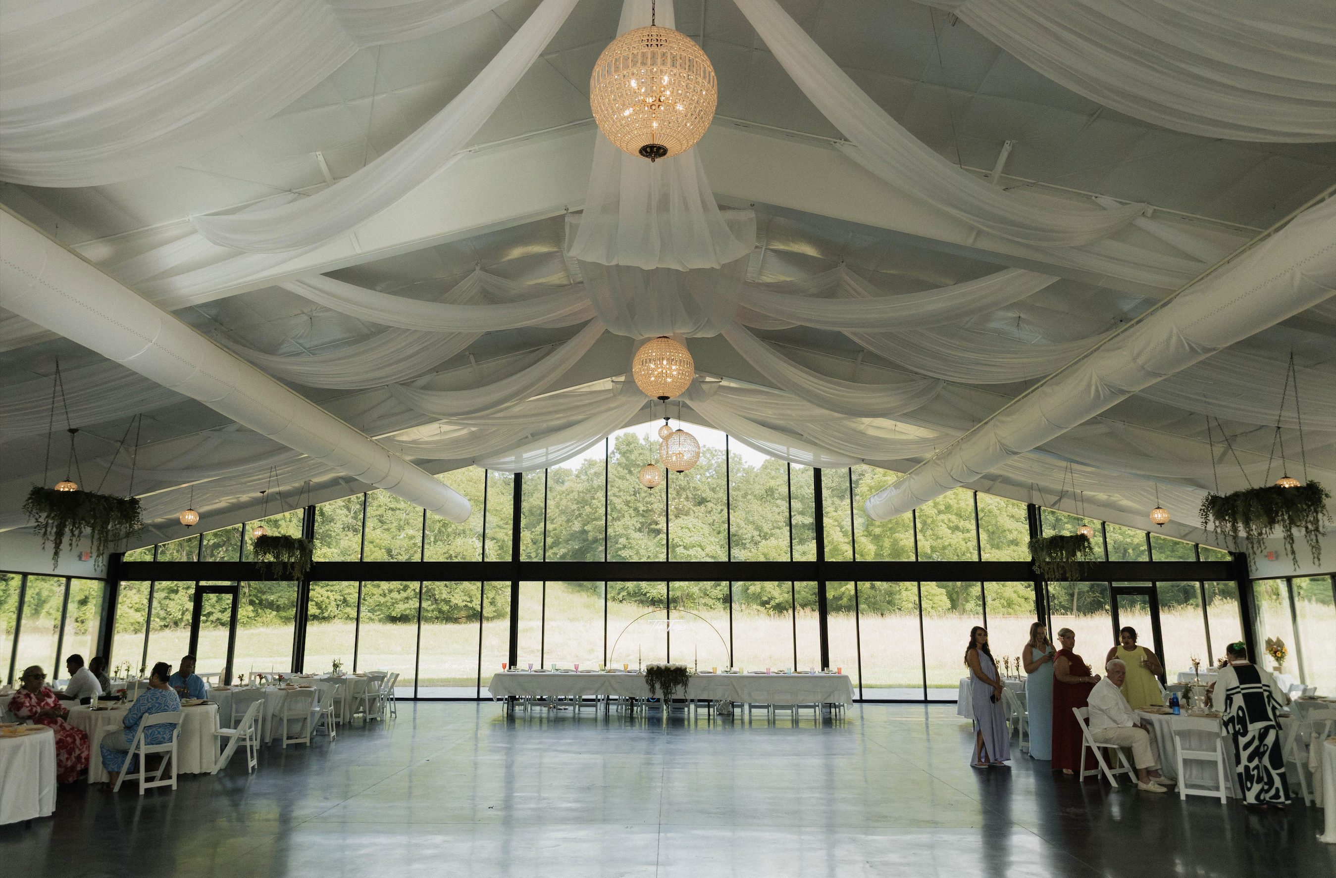 Our glass greenhouse event space offers a fully climate controlled setting surrounded by natural light and views of the property. With clean architectural lines and seamless indoor outdoor flow, it provides a bright, open canvas for ceremonies and receptions alike. The space comfortably accommodates up to 250 guests while maintaining an intimate and inviting atmosphere.