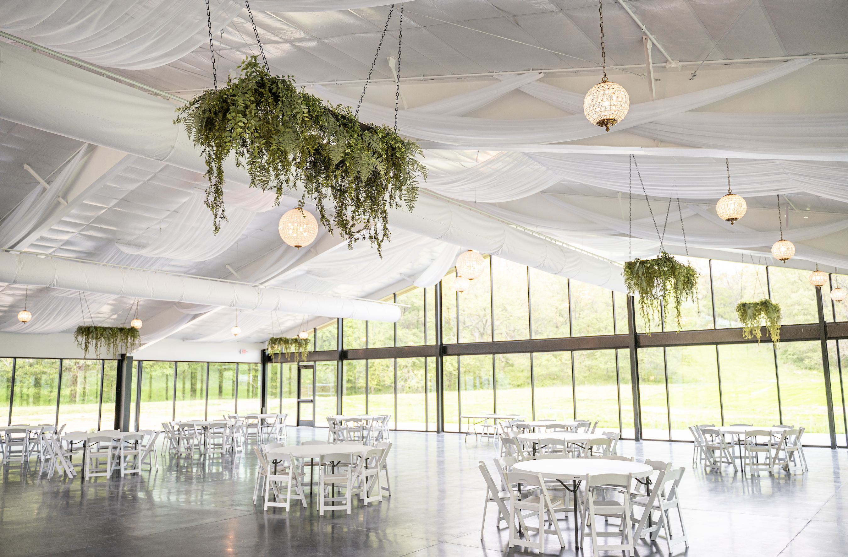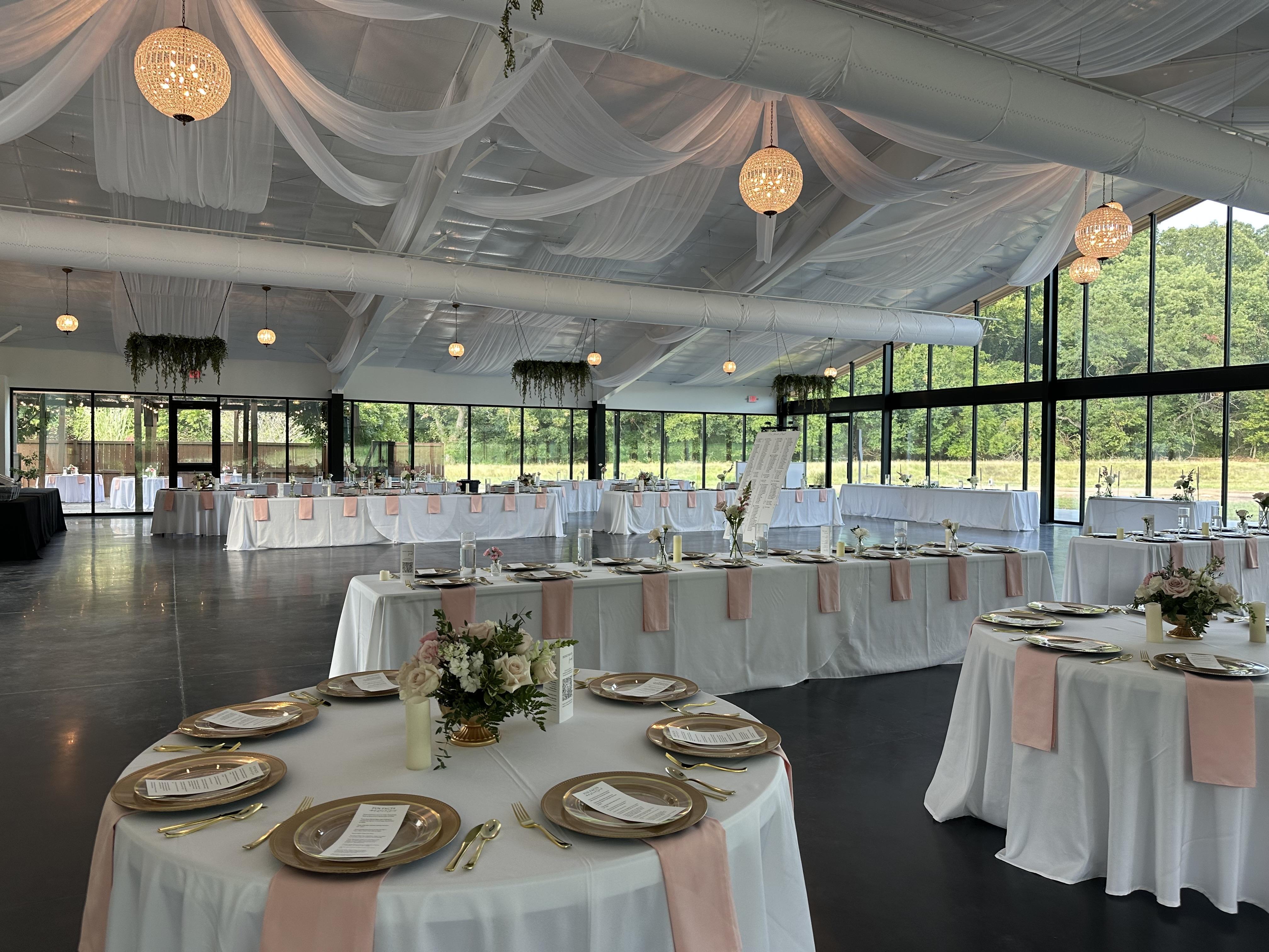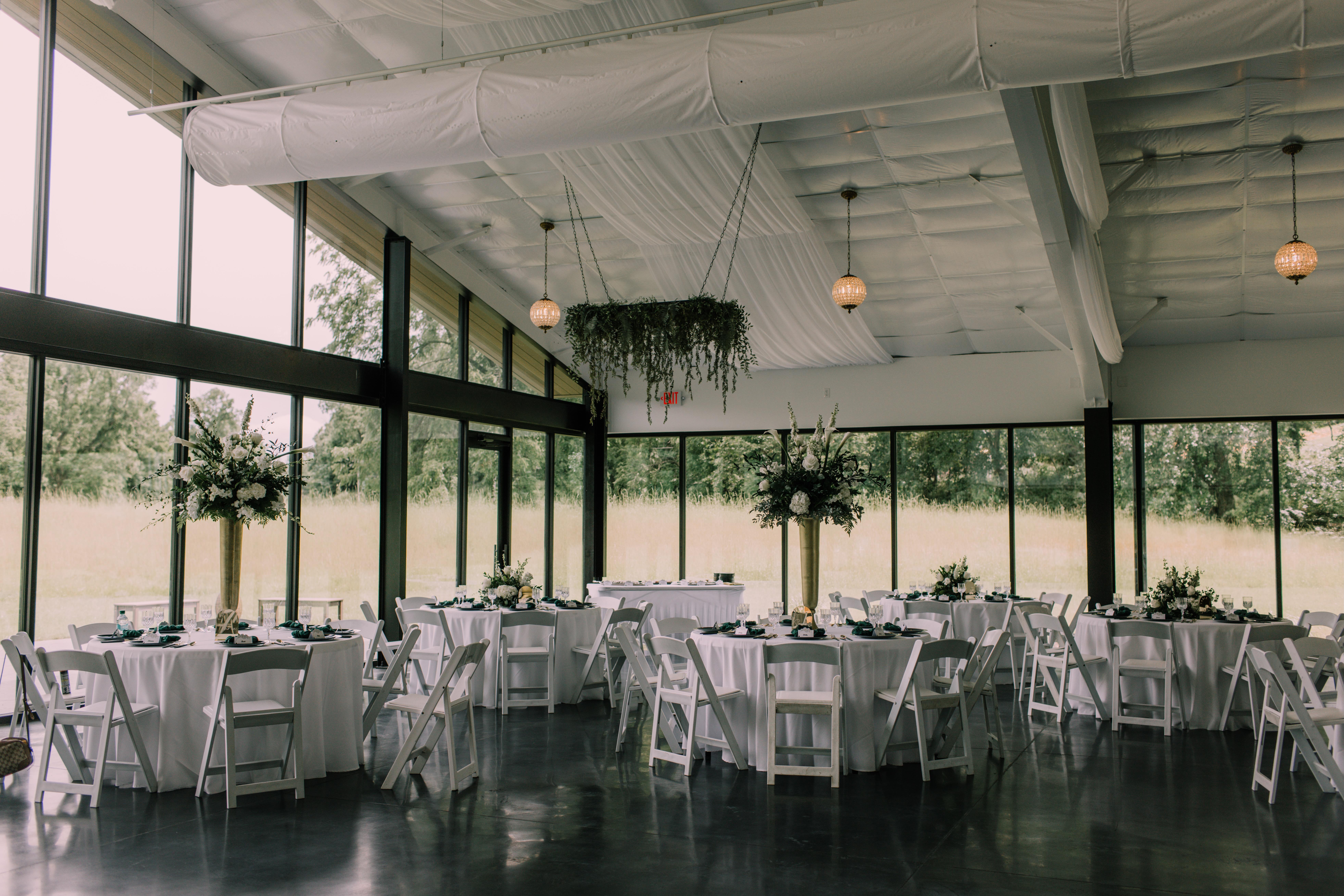 - Three customizable lighting zones - Overhead white draping with greenery - Spacious restrooms - Tables and chairs set prior to your rental period